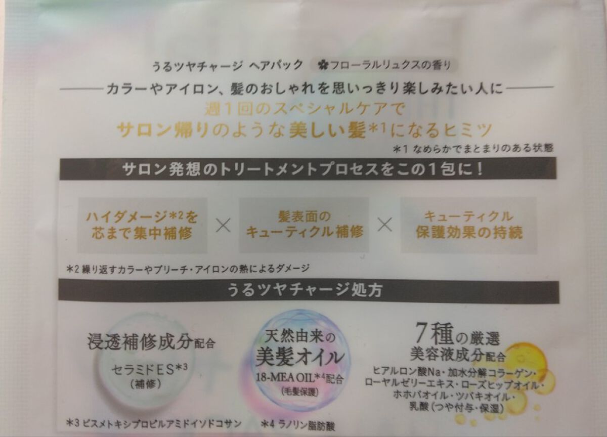 - ○カラーやアイロン、髪のおしゃれを思いっきり楽しみたい人に ○週1回のスペシャルケアで、サロン帰りのような美しい髪*へ(*なめらかでまとまりのある状態) 〇サロン発想のトリートメントプロセスがこの1包に! ○サロンのトリートメントプロセス ・ハイダメージ*を芯まで集中補修。(*繰り返すカラーやブリーチ・アイロンの熱によるダメージ) ・髪表面のキューティクルを補修 ・キューティクルの保護効果の持続 〇うるツヤチャージ処方 ・浸透補修成分配合:セラミドES*(補修)(*ビスメトキシプロピルアミドイソドコサン) ・天然由来の美髪オイル18-MEA OIL*配合(毛髪保護)(*ラノリン脂肪酸) ・7種の厳選美容液成分配合:ヒアルロン酸Na・加水分解コラーゲン・ローヤルゼリーエキス・ローズヒップオイル・ホホバホイル・ツバキオイル・乳酸(つや付与・保湿) 〇アイロン熱による髪ダメージや温度・摩擦等から髪を守り続ける”美髪バリア持続テクノロジー” 〇フローラルリュクスの香り