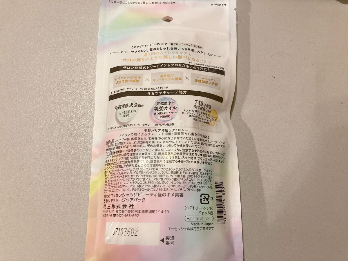 - ○カラーやアイロン、髪のおしゃれを思いっきり楽しみたい人に ○週1回のスペシャルケアで、サロン帰りのような美しい髪*へ(*なめらかでまとまりのある状態) 〇サロン発想のトリートメントプロセスがこの1包に! ○サロンのトリートメントプロセス ・ハイダメージ*を芯まで集中補修。(*繰り返すカラーやブリーチ・アイロンの熱によるダメージ) ・髪表面のキューティクルを補修 ・キューティクルの保護効果の持続 〇うるツヤチャージ処方 ・浸透補修成分配合:セラミドES*(補修)(*ビスメトキシプロピルアミドイソドコサン) ・天然由来の美髪オイル18-MEA OIL*配合(毛髪保護)(*ラノリン脂肪酸) ・7種の厳選美容液成分配合:ヒアルロン酸Na・加水分解コラーゲン・ローヤルゼリーエキス・ローズヒップオイル・ホホバホイル・ツバキオイル・乳酸(つや付与・保湿) 〇アイロン熱による髪ダメージや温度・摩擦等から髪を守り続ける”美髪バリア持続テクノロジー” 〇フローラルリュクスの香り