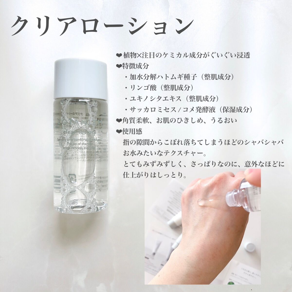 - 【ボタニズム クレンジングバター】 パルミチン酸エチルヘキシル、水、イソノナン酸イソトリデシル、ステアリン酸ポリグリセリル-10、イソステアリン酸PEG-6、ツバキ種子油、チャ葉エキス、ウメ果実エキス、シャクヤク根エキス、メリッサ葉エキス、フラーレン、グリチルリチン酸2K、カボス果皮油、ユズ果皮油、オレンジ果皮油、イヨカン果皮油、コウヤマキ枝/葉油、BG、トコフェロール、ステアリン酸グリセリル(SE)、ラウロイルメチルタウリンNa、酸化鉄、シリカ、PVP、エチルヘキシルグリセリン、ポリアミノプロピルビグアニド 【ボタニズム クレイウォッシュ】 水、グリセリン、BG、パルミチン酸エチルヘキシル、ベントナイト、コカミドプロピルベタイン、グリコシルトレハロース、ココイルグルタミン酸Na、海シルト、オリーブ葉エキス、ウメ果実エキス、シャクヤク根エキス、チャ葉エキス、メリッサ葉エキス、グリチルリチン酸2K、カボス果皮油、ユズ果皮油、オレンジ果皮油、イヨカン果皮油、コウヤマキ枝/葉油、グルコマンナン、加水分解水添デンプン、ラウロイルグルタミン酸ジ(フィトステリル/オクチルドデシル)、ダイマージリノール酸ダイマージリノレイルビス(ベヘニル/イソステアリル/フィトステリル)、クエン酸Na、クエン酸、乳酸、キサンタンガム、エチルヘキシルグリセリン、ペンテト酸5Na、ステアリン酸グリセリル、ミリスチン酸ポリグリセリル-10、セタノール、フェノキシエタノール 【ボタニズム クリアローション】 水、グリセリン、BG、サッカロミセス/コメ発酵液、ジグリセリン、グリコシルトレハロース、加水分解ハトムギ種子、ユキノシタエキス、乳酸桿菌/ダイコン根発酵液、ウメ果実エキス、シャクヤク根エキス、メリッサ葉エキス、チャ葉エキス、グリチルリチン酸2K、アラントイン、ニオイテンジクアオイ油、ダマスクバラ花油、パルマローザ油、ベルガモット果実油、ローズマリー葉油、カボス果皮油、加水分解水添デンプン、リンゴ酸、クエン酸Na、クエン酸、アニス酸Na、フィチン酸、レブリン酸Na、PPG-6デシルテトラデセス-30、ヤシ油脂肪酸PEG-7グリセリル、フェノキシエタノール 【ボタニズム エッセンスミルク】 水、サッカロミセス/コメ発酵液、プロパンジオール、グリセリン、スクワラン、トリ(カプリル酸/カプリン酸)グリセリル、ペンチレングリコール、ジグリセリン、BG、乳酸桿菌/ダイコン根発酵液、キハダ樹皮エキス、セラミドAG、セラミドAP、セラミドNG、セラミドEOP、セラミドNP、メリッサ葉エキス、チャ葉エキス、シャクヤク根エキス、ウメ果実エキス、グリチルリチン酸2K、ニオイテンジクアオイ油、ダマスクバラ花油、パルマローザ油、ベルガモット果実油、ローズマリー葉油、カボス果皮油、グリコシルトレハロース、フィトステロールズ、キサンタンガム、加水分解水添デンプン、エチドロン酸4Na、フィチン酸、ペンタステアリン酸ポリグリセリル-10、イソステアリン酸ポリグリセリル-10、水添レシチン、ステアロイルラクチレートNa、カルボマー、ベヘニルアルコール、トコフェロール、水酸化Na、フェノキシエタノール
