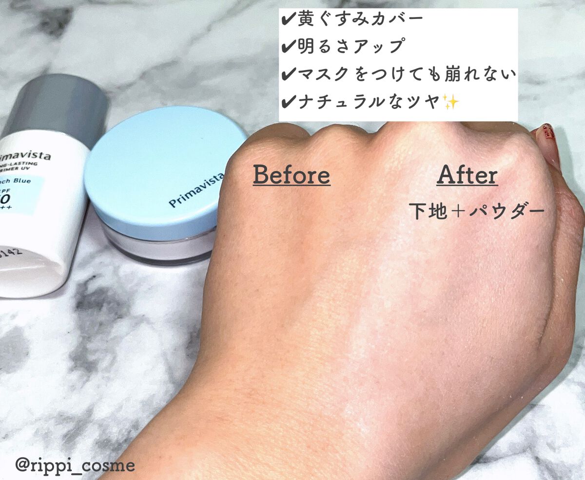 下地の使い心地は相変わらず良き💓 白浮きするかと思ったら、全然そんなことなく自然にトーンアップ✊🏻🏁 フェイスパウダーも青というより白に近くて肌に馴染むから、これも白浮きなし🤗