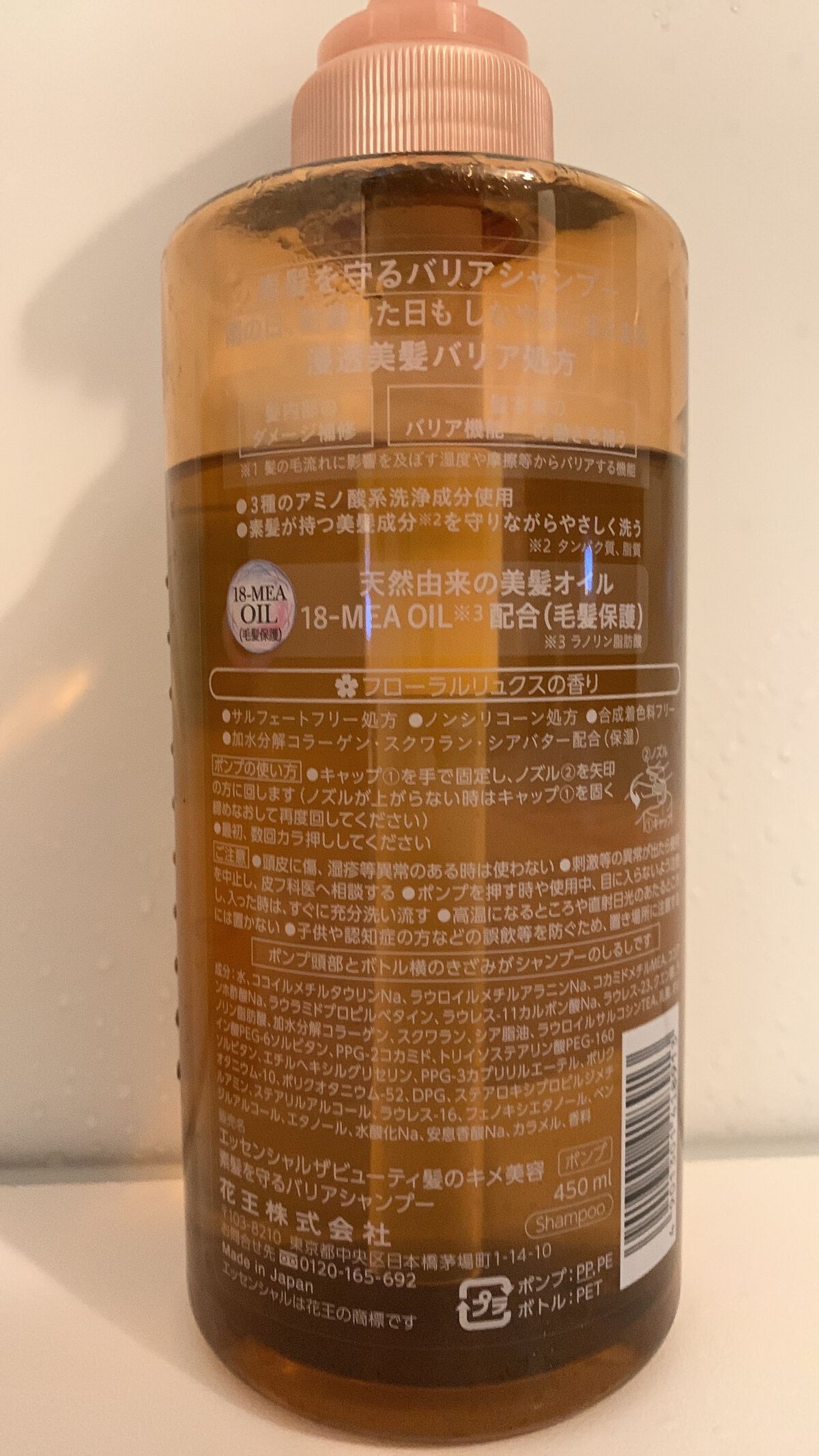 エッセンシャルプレミアムバリアシャンプー・コンディショナーシルキー&スムース〈説明〉・シャンプー・コンディショナー・450ml(両方とも)〈感想〉ホワイトピーチ&ムスクの香りは良い匂いで良かったです。シャンプーの洗浄力には私的には満足しました...