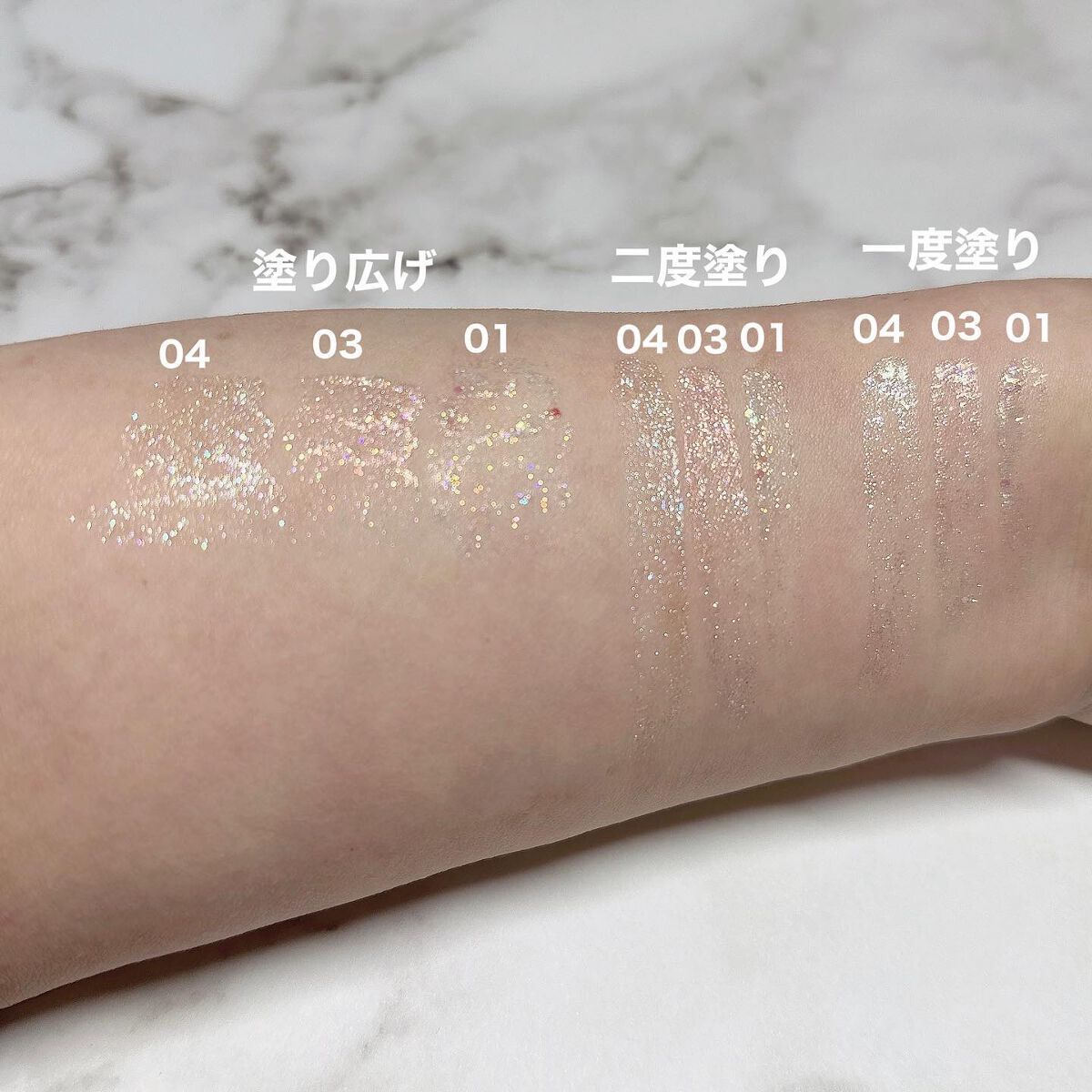 テクスチャーはサラサラだけど、飛び散るわけではなくて吸い付いてくる感じでした。 グリッターは、湿式のウェットさと押すとムニっとして、ちょっとゼリーテイストな気がします。ギラギラすぎなくて使いやすかったです。 ⑥はピンクも混ざっていてとても可愛い。アイスクリーム屋さんのストロベリーチーズケーキみたいな🍓これも、白すぎなくて肌馴染みの良い白系なので使いやすかったです。