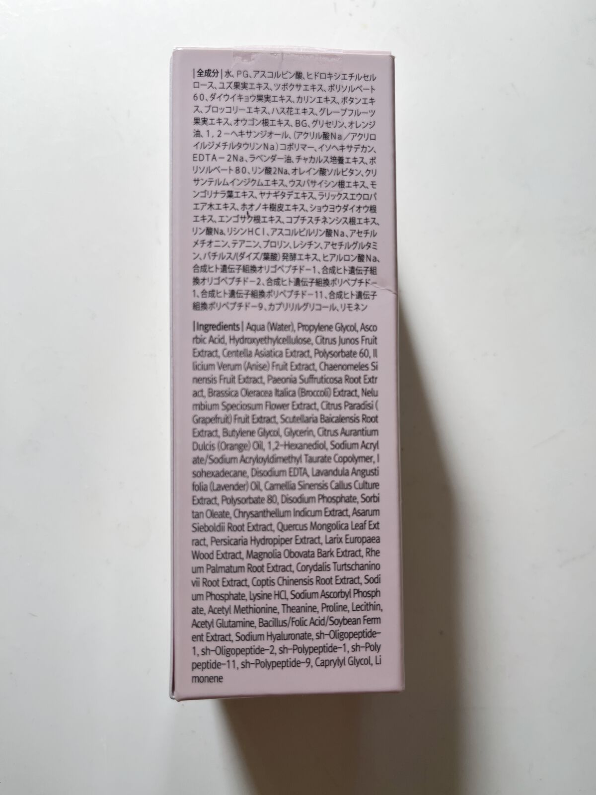 - <35ml> 水、PG、アスコルビン酸、ヒドロキシエチルセルロース、ユズ果実エキス、ツボクサエキス、ポリソルベート60、ダイウイキョウ果実エキス、カリンエキス、ボタンエキス、ブロッコリーエキス、ハス花エキス、グレープフルーツ果実エキス、オウゴン根エキス、BG、グリセリン、オレンジ油、1,2-ヘキサンジオール、(アクリル酸Na/アクリロイルジメチルタウリンNa)コポリマー、イソヘキサデカン、EDTA-2Na、ラベンダー油、チャカルス培養エキス、ポリソルベート80、リン酸2Na、オレイン酸ソルビタン、クリサンテルムインジクムエキス、ウスバサイシン根エキス、モンゴリナラ葉エキス、ヤナギタデエキス、ラリックスエウロパエア木エキス、ホオノキ樹皮エキス、ショウヨウダイオウ根エキス、エンゴサク根エキス、コプチスチネンシス根エキス、リン酸Na、リシンHCl、アスコルビルリン酸Na、アセチルメチオニン、テアニン、プロリン、レシチン、アセチルグルタミン、バチルス/(ダイズ/葉酸)発酵エキス、ヒアルロン酸Na、合成ヒト遺伝子組換オリゴペプチド-1、合成ヒト遺伝子組換オリゴペプチド-2、合成ヒト遺伝子組換ポリペプチド-1、合成ヒト遺伝子組換ポリペプチド-11、合成ヒト遺伝子組換ポリペプチド-9、カプリリルグリコール、リモネン