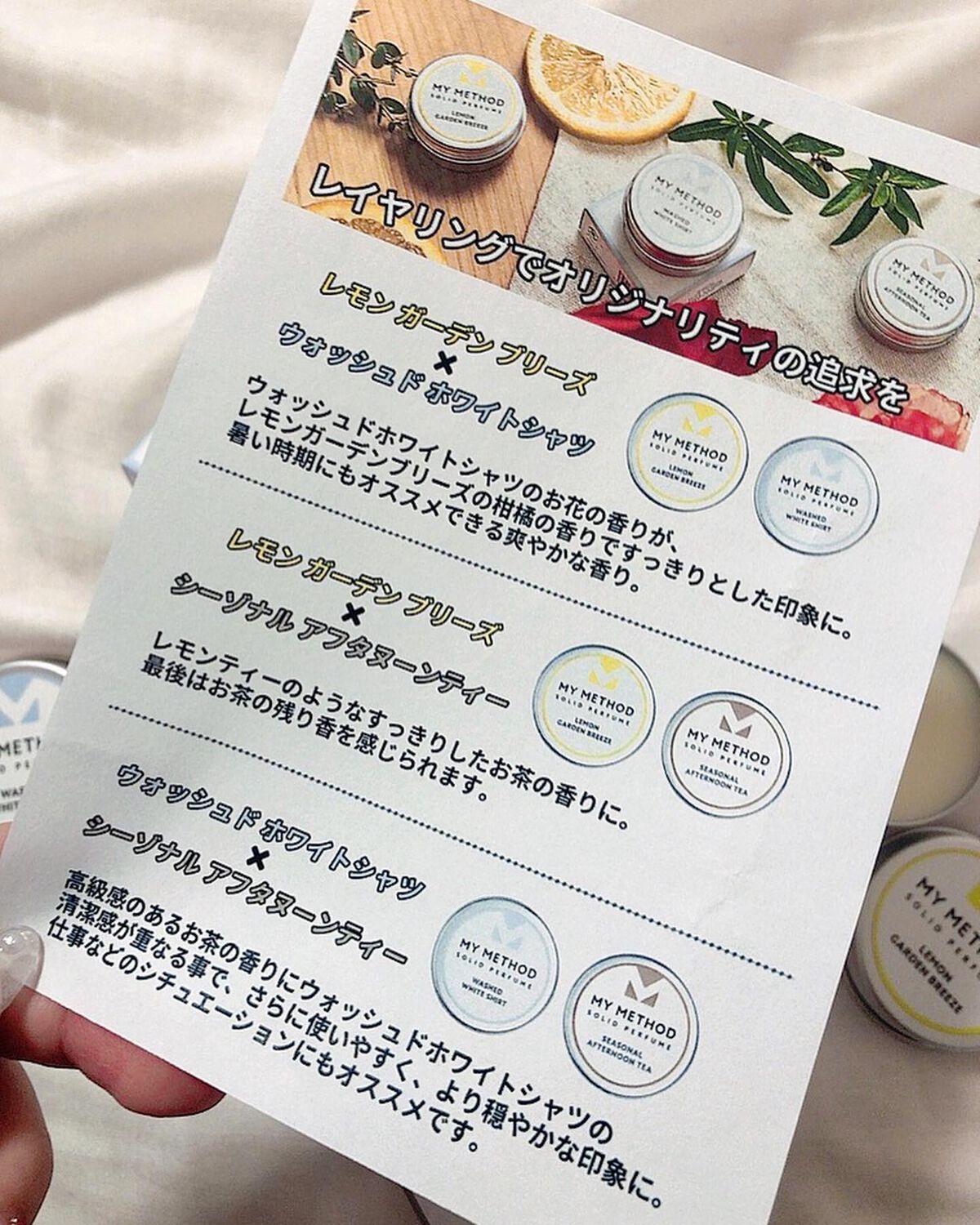 MY METHODソリッドパフュームは、使いやすい練り香水✨ 香りの強い香水は苦手だけど、柔らかくほのかに香る香りは身につけたい😆🎶 個々の香りも素敵だけど、この練り香水の楽しみ方は「レイヤリング」😊🎶 最初は一つ一つの香りを楽しみ、気分でレイヤリングするのもありです🙋♀️💨 手のひらにすっぽり隠れるサイズだから、ポーチに入れても邪魔にならない😊💕
