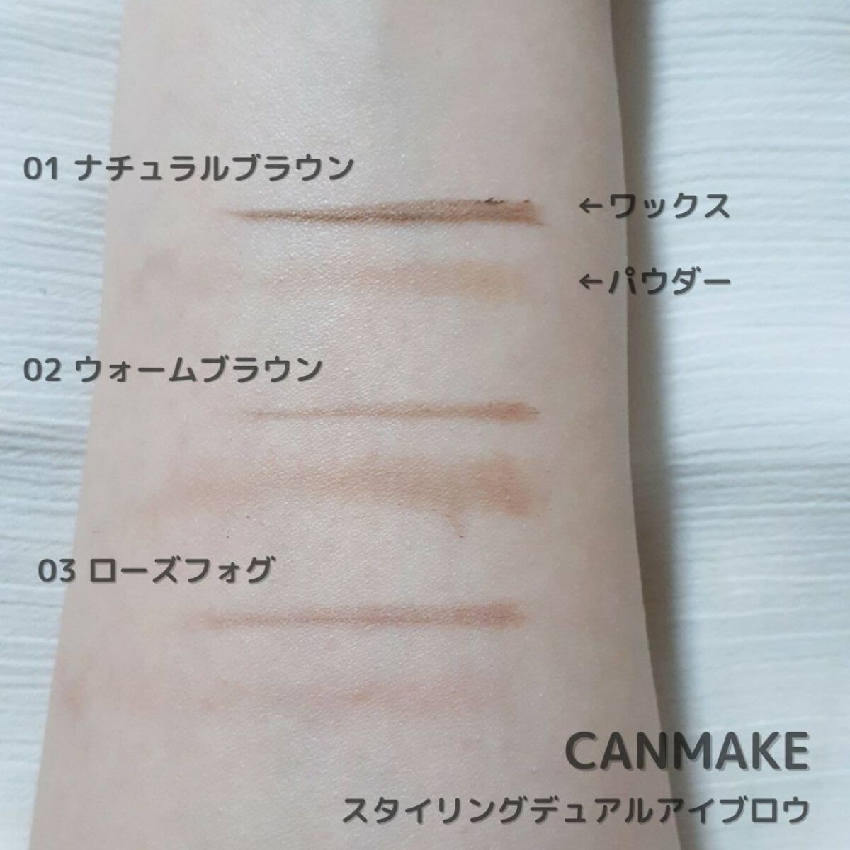 - ワックス×パウダー 異なる質感で作るふんわり立体眉 ワックスベースとパウダーベース、2つの異なる質感・発色を重ねることで、 絶妙なニュアンスを生み出しまるで本物の眉のような仕上がりに。 ワックスベースの上にパウダーベースを重ねることで、密着力がUP! メイクしたての仕上がりをキープできます! ◆ワックスベース◆ しっかりと発色する濃いめのカラーは、眉毛の隙間を埋めつつ眉の形を整えます。 ワックスなのにベタつかず、毛の立ち上がりをしっかりキープ。毛流れを感じる眉に仕上がります。 ★伸びが良くムラになりにくいため、初心者さんでも描きやすい! ◆パウダーベース◆ ふんわりと発色する淡めのカラーは、眉に奥行きが出て、立体的に仕上がります。