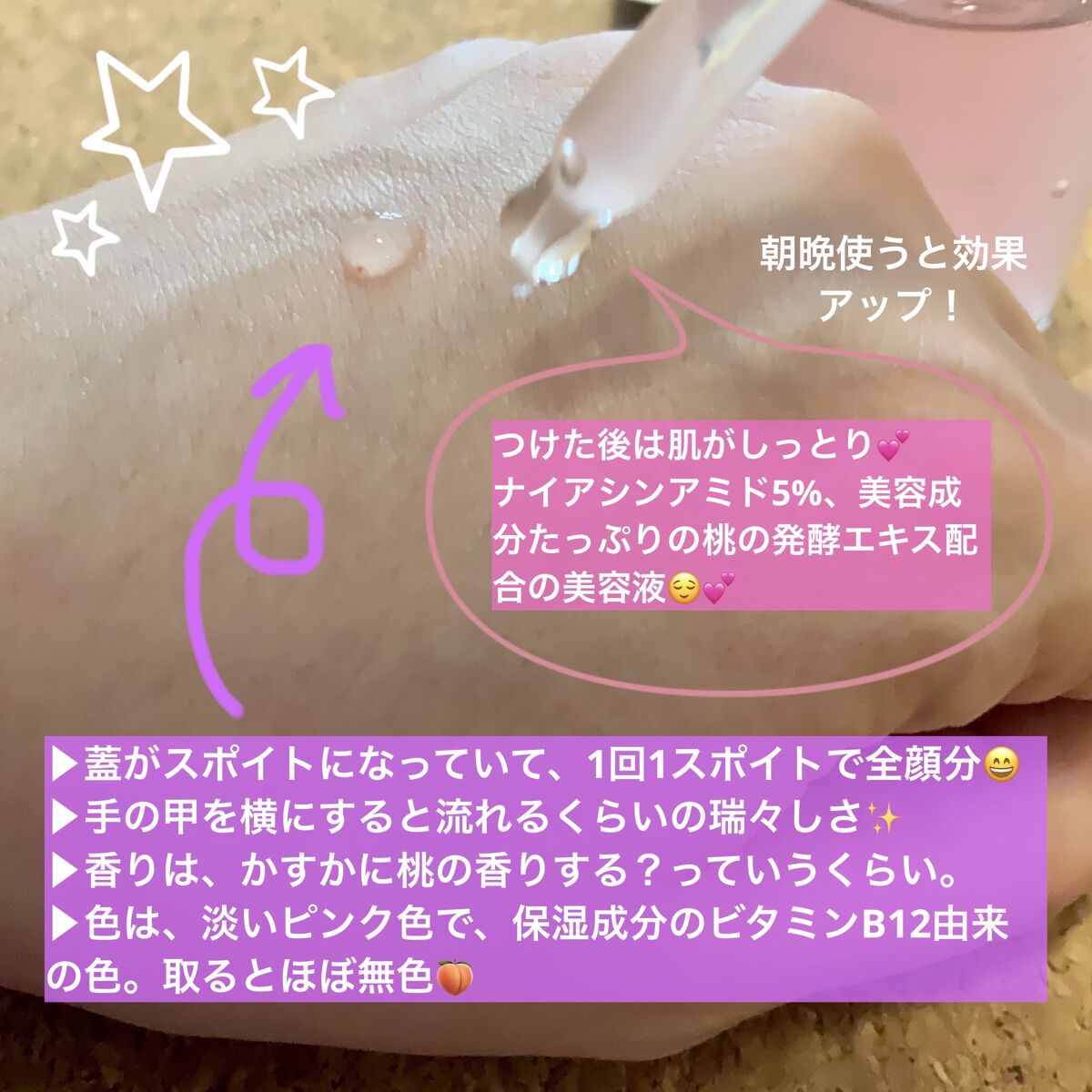 - 桃から抽出した自然由来成分、PEACHNIA(TM)を70%配合しており、たっぷり含まれるビタミン、ポリフェノール、タンニンなどの美容成分が肌を明るく輝かせます。さらに、肌の透明感を上げるナイアシンアミドを5%配合しており、シミ・そばかすの元となるメラニンが肌表面に露出することを阻害して透明感のある、クリアな肌へ。天然由来のやさしい成分が肌にダメージを与えることなく、肌のトーン、キメ、ツヤが美しく整った、つるんと白桃肌を叶えます。