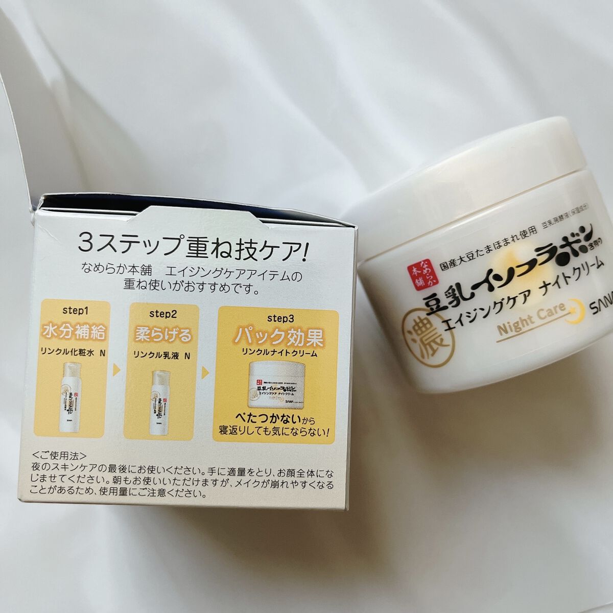 - リンクルラインからナイトクリームが新登場! ピュアレチノール*1を新配合の濃厚クリームが一晩かけて密着して浸透*2する、おやすみパック処方です。 商品特徴 〔 ①ピュアレチノール*1×豆乳発酵液*1配合で本格スキンケア 〕 『なめらか本舗』オリジナルのイソフラボン含有の豆乳発酵液*1に加え、ピュアレチノール*1を新配合! お肌にハリ・弾力感を与えます。 〔 ②夜のしっかりケアで乾燥による小じわを目立たなくします*3! 〕 肌ストレスの少ない夜のお手入れをおすすめします。 新登場のナイトクリームはおやすみパック処方を採用し、濃厚なクリームが一晩中肌に密着しつつ、乾燥による小じわ目立たなくします。 〔 ③3ステップの重ね技ケア! 〕 化粧水、乳液も新テクスチャーで保湿感がパワーアップ! リンクルライン3品一緒に使用するのがおすすめです。 *1 保湿成分 *2 角層まで *3 効能評価試験済み