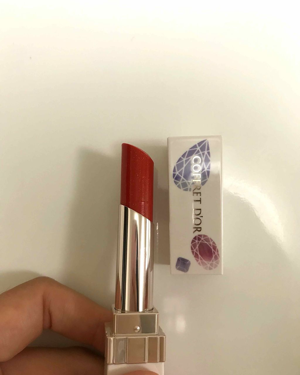 完全にパケ買いです😅以前からオレンジ系の口紅が欲しくて、今までは某プチプラコスメのオレンジ口紅を使用していました。この商品を一目見て気に入り、お店の方にお試しでつけていただきました。小さなラメが上品に光ってみずみずしい感じがしました。個人的に...