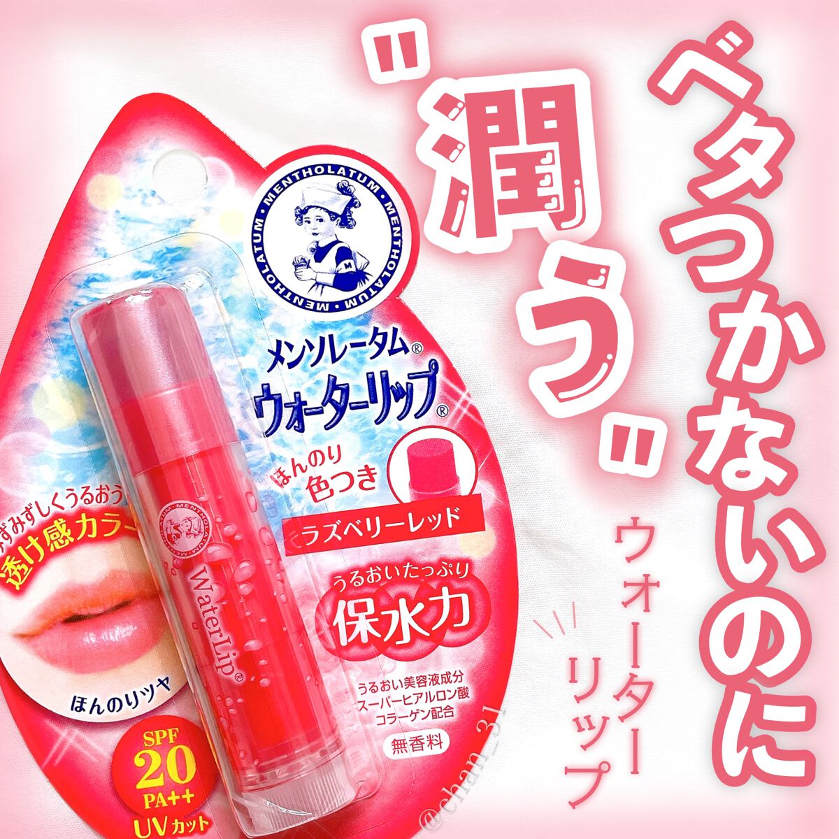 - ウォーターリップシリーズならではの、うるおい感たっぷりの処方。 4つのうるおい成分(スーパーヒアルロン酸*1、アロエベラ葉エキス、コラーゲン*2、はちみつ)をギュッと閉じ込めました。 またUVカット成分も配合。SPF20/PA++で、日中のおでかけにもおすすめです。 グロスやルージュの代わりとしても使えます。 無香料。