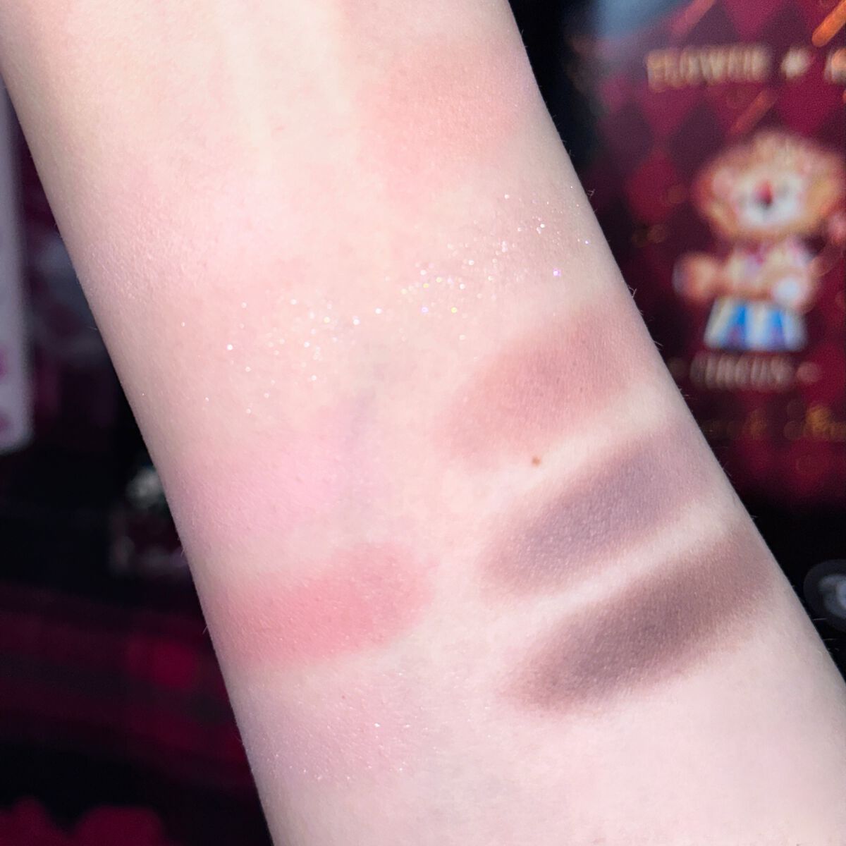 淡めカラーで構成されたパレット! 青みピンクからオレンジみコーラルまで入っていて色々なメイクが楽しめそう! 右上のくまちゃん型押しがかわいすぎて…この色かわいいのに使いたくない…!