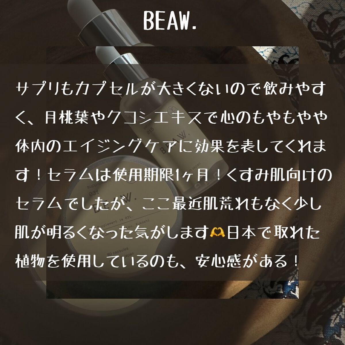 - ・BEAW.のパーソナライズケアは始めにパーソナライズ診断を行い、20種類の和漢と、自然由来の保湿成分の組み合わせから、一人ひとりに合わせた製品をお届けします。 ・現在の自分の悩みにぴったりのパーソナルケアキット、和漢植物由来成分を配合した2剤式のセラムとサプリメントのセットでお届けします。からだの内と外から同時に理想の美しさをめざせるデュアルケアで、あなたの美容をサポートします。 ・美容液は、肌荒れ予防、乾燥、毛穴、テカリ、くすみ*、年齢肌、ツヤ肌、などその人それぞれの悩みに対して適した処方で国産和漢植物成分と、植物エキス、ビタミンやセラミド、プラセンタ、ナイアシンアミド、などを配合した保湿成分を分析結果に合わせて配合。*乾燥による ・サプリメントは体の内側からキレイをサポートする国産和漢植物成分と20種類以上のビタミン、ミネラルをそれぞれに合わせて配合。 -対象商品- BEAW.リッチセラム003、008、015 BEAW.サプリメント:001、007、031 BEAW.フェイスウォッシュ:019、026、045 -内容量- BEAW.リッチセラム:30ml BEAW.サプリメント:60粒 BEAW.フェイスウォッシュ:80g