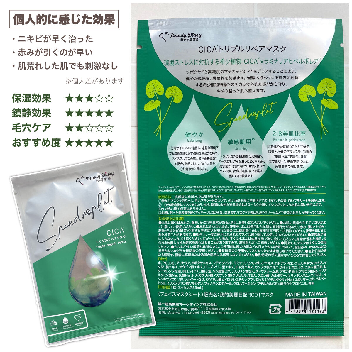 薄手の密着力が高いシートです!とろみのある美容液がたっぷり含まれています🌿 CICAが配合されていて肌荒れを防いでくれるので、肌荒れが気になる時によく使っています! パック後は肌の赤みが落ち着きますし、もっちりとしてキメの整った肌になります😌