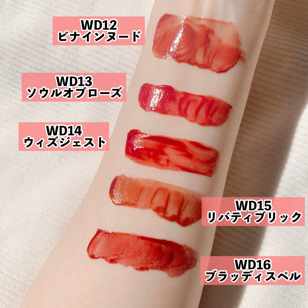 - <WD2 ビトゥン ローズ> 水、ジフェニルジメチコン、リンゴ酸ジイソステアリル、ビスジグリセリルポリアシルアジペート-2、水添ポリイソブテン、ジグリセリン、DPG、セチルPEG/PPG-10/1ジメチコン、イソステアリン酸ソルビタン、ポリソルベート60、ペンチレングリコール、オクチルドデカノール、セテアレス-20、(アクリル酸ヒドロキシエチル/アクリロイルジメチルタウリンNa)コポリマー、スクワラン、フェノキシエタノール、ポリグリセリン-3、ステビオシド、香料、エチルヘキシルグリセリン、グリセリン、シア脂、ツバキ種子油、トリ(カプリル酸/カプリン酸)グリセリル、アルガニアスピノサ核油、ホホバ種子油、アーモンド油、アンズ核油、月見草油、オリーブ果実油、テトラ(ジ-t-ブチルヒドロキシヒドロケイヒ酸)ペンタエリスリチル、カニナバラ果実エキス、マンゴー果実エキス、赤104(1)、赤227、黄5、青1 <WD3 ピンク ヘイズ> 水、ジフェニルジメチコン、リンゴ酸ジイソステアリル、ビスジグリセリルポリアシルアジペート-2、水添ポリイソブテン、ジグリセリン、DPG、セチルPEG/PPG-10/1ジメチコン、イソステアリン酸ソルビタン、ポリソルベート60、ペンチレングリコール、オクチルドデカノール、セテアレス-20、(アクリル酸ヒドロキシエチル/アクリロイルジメチルタウリンNa)コポリマー、スクワラン、フェノキシエタノール、ポリグリセリン-3、ステビオシド、香料、エチルヘキシルグリセリン、グリセリン、水酸化Al、ポリアクリル酸アンモニウム、BG、アルガニアスピノサ核油、シア脂、ツバキ種子油、トリ(カプリル酸/カプリン酸)グリセリル、アーモンド油、アンズ核油、ホホバ種子油、月見草油、オリーブ果実油、テトラ(ジ-t-ブチルヒドロキシヒドロケイヒ酸)ペンタエリスリチル、マンゴー果実エキス、カニナバラ果実エキス、酸化チタン、赤104(1)、赤227、黄5、青1 <WD4 オールウェイズ ヤング> 水、ジフェニルジメチコン、リンゴ酸ジイソステアリル、ビスジグリセリルポリアシルアジペート-2、水添ポリイソブテン、ジグリセリン、DPG、セチルPEG/PPG-10/1ジメチコン、イソステアリン酸ソルビタン、ポリソルベート60、ペンチレングリコール、オクチルドデカノール、セテアレス-20、(アクリル酸ヒドロキシエチル/アクリロイルジメチルタウリンNa)コポリマー、スクワラン、フェノキシエタノール、ポリグリセリン-3、ステビオシド、香料、エチルヘキシルグリセリン、グリセリン、シア脂、ツバキ種子油、トリ(カプリル酸/カプリン酸)グリセリル、アルガニアスピノサ核油、ホホバ種子油、アーモンド油、アンズ核油、月見草油、オリーブ果実油、テトラ(ジ-t-ブチルヒドロキシヒドロケイヒ酸)ペンタエリスリチル、カニナバラ果実エキス、マンゴー果実エキス、赤104(1)、赤227、黄5、青1 <WD6 クラッシュド パンプキン> 水、水添ポリイソブテン、リンゴ酸ジイソステアリル、ビスジグリセリルポリアシルアジペート-2、ジフェニルシロキシフェニルトリメチコン、ジフェニルジメチコン、ポリグリセリン-3、オクチルドデカノール、ポリソルベート60、セチルPEG/PPG-10/1ジメチコン、ラウリン酸ポリグリセリル-10、ペンチレングリコール、1,2-ヘキサンジオール、(アクリル酸ヒドロキシエチル/アクリロイルジメチルタウリンNa)コポリマー、PEG-60水添ヒマシ油、セテアリルアルコール、スクワラン、キシリトール、エチルヘキシルグリセリン、香料、ポリアクリル酸アンモニウム、イソステアリン酸ソルビタン、水酸化Al、フェノキシエタノール、BG、トコフェロール、酸化チタン、酸化鉄、赤227、黄4、黄5、青1 <WD8 ビンテージ カラント> 水、水添ポリイソブテン、リンゴ酸ジイソステアリル、ビスジグリセリルポリアシルアジペート-2、ジフェニルシロキシフェニルトリメチコン、ジフェニルジメチコン、オクチルドデカノール、ポリグリセリン-3、ポリソルベート60、セチルPEG/PPG-10/1ジメチコン、ラウリン酸ポリグリセリル-10、1,2-ヘキサンジオール、ペンチレングリコール、(アクリル酸ヒドロキシエチル/アクリロイルジメチルタウリンNa)コポリマー、PEG-60水添ヒマシ油、セテアリルアルコール、スクワラン、キシリトール、エチルヘキシルグリセリン、香料、イソステアリン酸ソルビタン、トコフェロール、赤104(1)、赤227、黄5、青1 <WD9 ミスター ストレンジャー> 水、水添ポリイソブテン、リンゴ酸ジイソステアリル、ビスジグリセリルポリアシルアジペート-2、ジフェニルシロキシフェニルトリメチコン、ジフェニルジメチコン、オクチルドデカノール、ポリグリセリン-3、ポリソルベート60、セチルPEG/PPG-10/1ジメチコン、ラウリン酸ポリグリセリル-10、1,2-ヘキサンジオール、ペンチレングリコール、(アクリル酸ヒドロキシエチル/アクリロイルジメチルタウリンNa)コポリマー、セテアリルアルコール、PEG-60水添ヒマシ油、スクワラン、キシリトール、エチルヘキシルグリセリン、香料、イソステアリン酸ソルビタン、水酸化Al、ポ