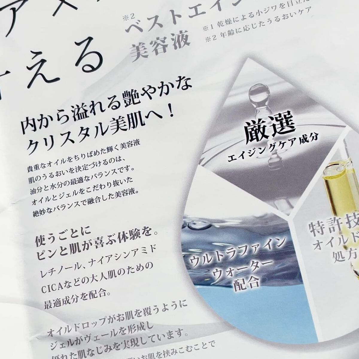 特許取得のオイルドロップ処方×世界初ウルトラファインウォーターを使用した、貴重なオイルをちりばめた輝く美容液です💭 わたしは普段さっぱりとしたスキンケアが好みなので、オイルの使用頻度は低いのですが、この美容液はオイルなのにベタつきにくくて使い心地がすごくよかったてす!! 肌が引き締まる感じもあって、使い続けたい美容液でした👏