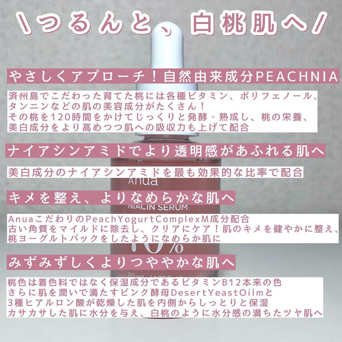 .Anua(アヌア)桃70%ナイアシンセラム30ml以前Anuaドクダミ80%水分沈静アンプルを試させていただいてリピートして愛用中なんですがなんと今回は2023年1月1日に新発売されているこちらを試させていただきました🍑「つるんと白桃肌を叶...