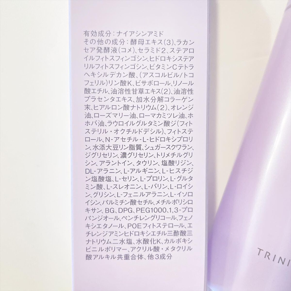 - <50g> 水溶性プラセンタエキス、グリチルリチン酸ジカリウム、酵母エキス(3)、ラカンセア発酵液(コメ)、水添大豆リン脂質、セラミド2、ステアロイルフィトスフィンゴシン、ヒドロキシステアリルフィトスフィンゴシン、ビタミンCテトラヘキシルデカン酸、(アスコルビル/トコフェリル)リン酸K、油溶性プラセンタエキス、ビサボロール、リノール酸エチル、油溶性甘草エキス(2)、油溶性カミツレエキス、リン酸化オリゴ糖カルシウム、アセチルグルコサミン、ラウロイルグルタミン酸ジ(フィトステリル・オクチルドデシル)、フィトステロール、N-アセチル-L-ヒドロキシプロリン、L-ヒドロキシプロリン、ツボクサエキス、ヒアルロン酸ナトリウム(2)、加水分解ヒアルロン酸、アセチル化ヒアルロン酸ナトリウム、ヒアルロン酸ヒドロキシプロピルトリモニウム、加水分解コラーゲン末、シュガースクワラン、2-メタクリロイルオキシエチルホスホリルコリン・メタクリル酸ステアリル共重合体、PVP、イノシット、ジグリセリン、濃グリセリン、マルチトール、トリメチルグリシン、PEG1000、POPメチルグルコシド、アラントイン、タウリン、塩酸リジン、DL-アラニン、L-アルギニン、L-ヒスチジン塩酸塩、L-セリン、L-プロリン、L-グルタミン酸、L-スレオニン、L-バリン、L-ロイシン、グリシン、L-フェニルアラニン、L-イソロイシン、BG、DPG、1,3-プロパンジオール、ペンチレングリコール、グリセリンエチルヘキシルエーテル、フェノキシエタノール、オレンジ油、ローズマリー油、ローマカミツレ油、POEフィトステロール、エチレンジアミンヒドロキシエチル三酢酸三ナトリウム二水塩、水酸化K、カルボキシビニルポリマー、アクリル酸・メタクリル酸アルキル共重合体、キサンタンガム