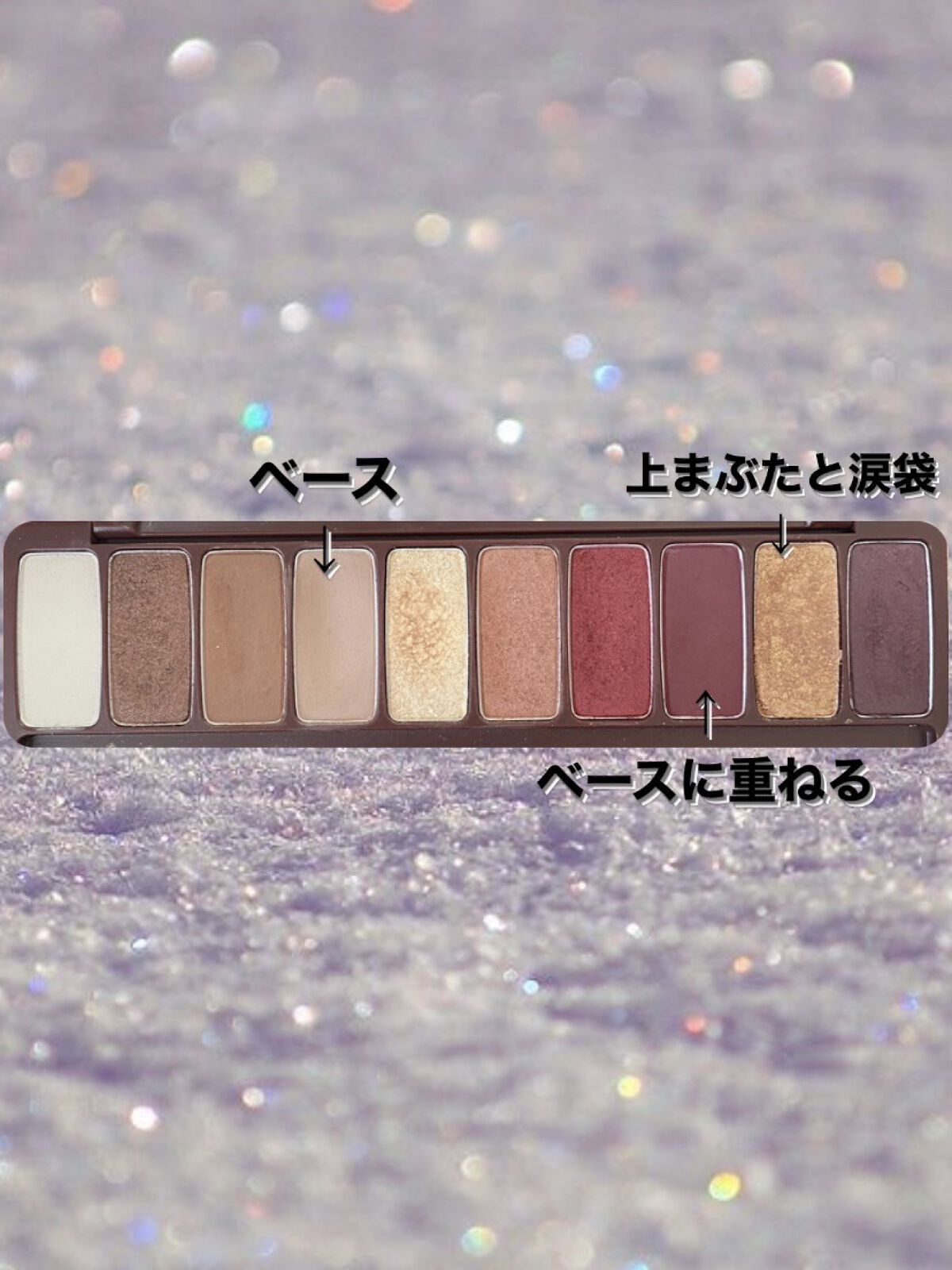 rom&ndベターザンパレット03の薄い色をとってまぶたに乗せます キャンメイクパーフェクトスタイリストアイズNo.14の右上の色をベースに重ねます rom&ndベターザンパレット03の大粒のグリッターラメを涙袋に乗せます rom&ndベターザンパレット03の細かいラメを黒目の上に乗せたら完成です!