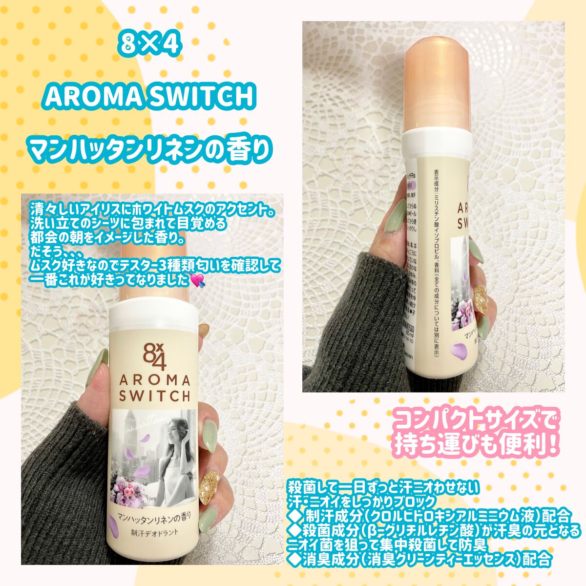清々しいアイリスにホワイトムスクのアクセント。洗い立てのシーツに包まれて目覚める都会の朝をイメージした香りとのこと。 塗ってすぐサラッとする所とパケが可愛い所は良かったです🫶 汗をかくと、そのたびに香りが飛び出すことで、朝使った時の香りが長時間持続するだけでなく、汗が気になるたびに、何度も新鮮な香りがはじけるそう