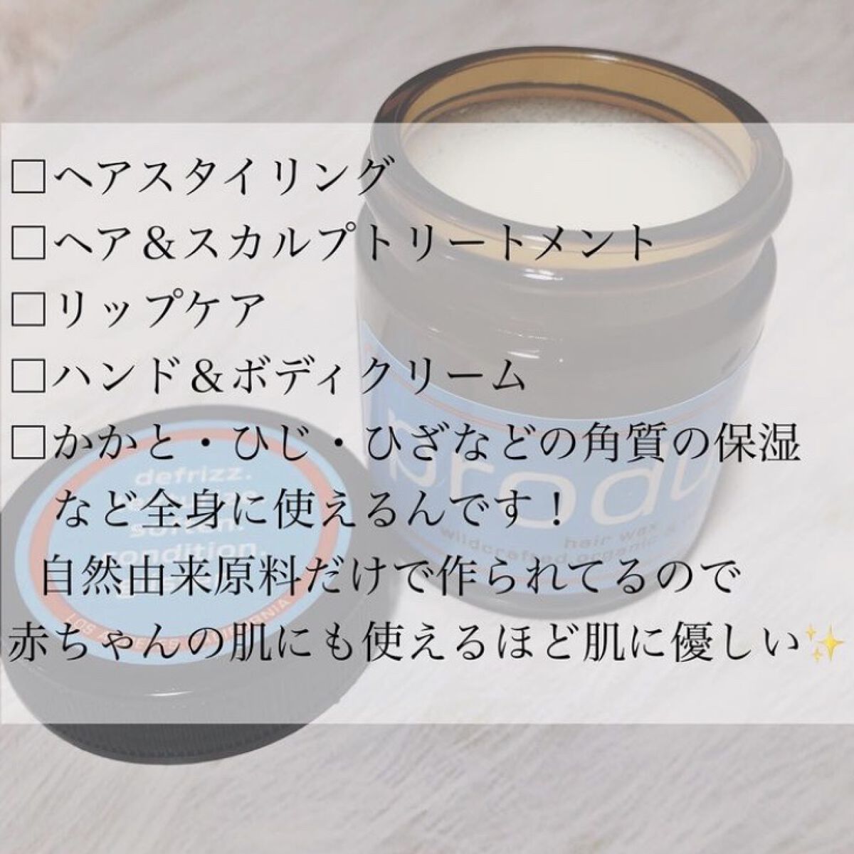 - ヘアスタイリングはもちろん、髪・肌・リップ・ネイルなど全身に潤いを与え保湿ケアできる、天然由来原料だけで作られたマルチバーム。 柑橘系の爽やかな香り。コンパクトなサイズで持ち運びにも便利。 外出先でもこれ一つでヘアスタイリングから、あらゆるケアに活躍。