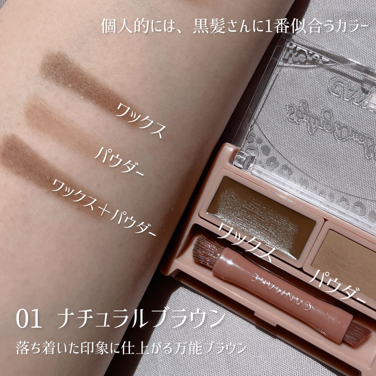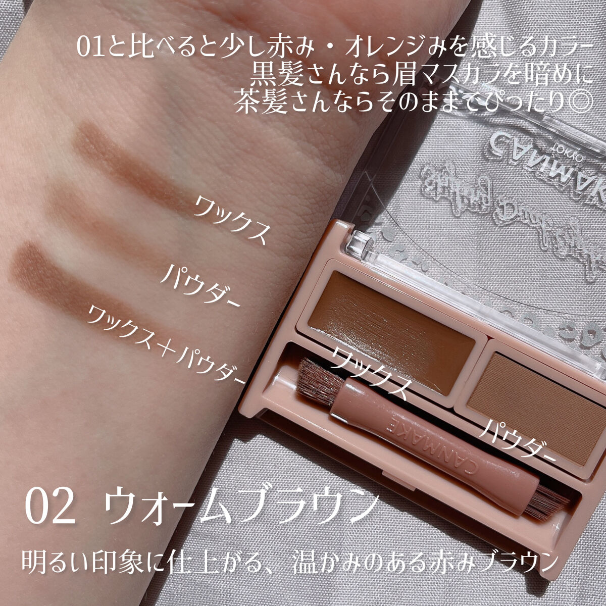- ワックス×パウダー 異なる質感で作るふんわり立体眉 ワックスベースとパウダーベース、2つの異なる質感・発色を重ねることで、 絶妙なニュアンスを生み出しまるで本物の眉のような仕上がりに。 ワックスベースの上にパウダーベースを重ねることで、密着力がUP! メイクしたての仕上がりをキープできます! ◆ワックスベース◆ しっかりと発色する濃いめのカラーは、眉毛の隙間を埋めつつ眉の形を整えます。 ワックスなのにベタつかず、毛の立ち上がりをしっかりキープ。毛流れを感じる眉に仕上がります。 ★伸びが良くムラになりにくいため、初心者さんでも描きやすい! ◆パウダーベース◆ ふんわりと発色する淡めのカラーは、眉に奥行きが出て、立体的に仕上がります。