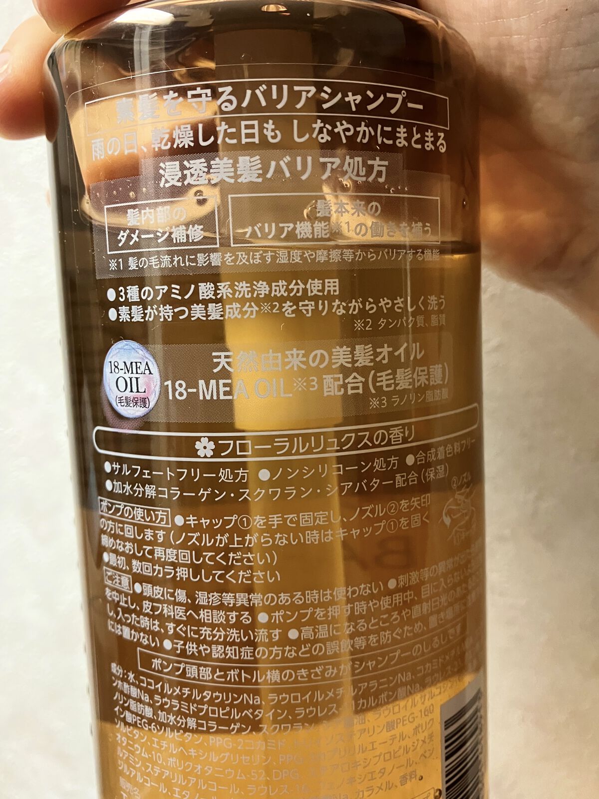- うる髪続くバリアシャンプー・コンディショナー 雨の日、乾燥した日も しなやかにまとまる 【バリアシャンプー・コンディショナー共通】 ●浸透美髪バリア処方 ・髪内部のダメージ補修 ・ 髪本来のバリア機能*の働きを補う *髪の毛流れに変化を及ぼす湿度・摩擦等からバリアする機能 ●天然由来の美髪オイル 18-MEA OIL*配合(毛髪保護)*ラノリン脂肪酸 ●サルフェートフリー処方 ●合成着色料フリー ●加水分解コラーゲン・スクワラン・シアバター配合(保湿) ✿フローラルリュクスの香り 【バリアシャンプー】 ●3種のアミノ酸系洗浄成分使用 ●とろふわスフレ泡で素髪が持つ美髪成分*を守りながらやさしく洗う *タンパク質、脂質 ●ノンシリコーン処方 【バリアコンディショナー】 ●傷んだ髪を集中補修&コート ●湿度や摩擦等の外部刺激から髪を守る ●セラミドES*配合(補修)*ビスメトキシプロプルアミドイソドコサン