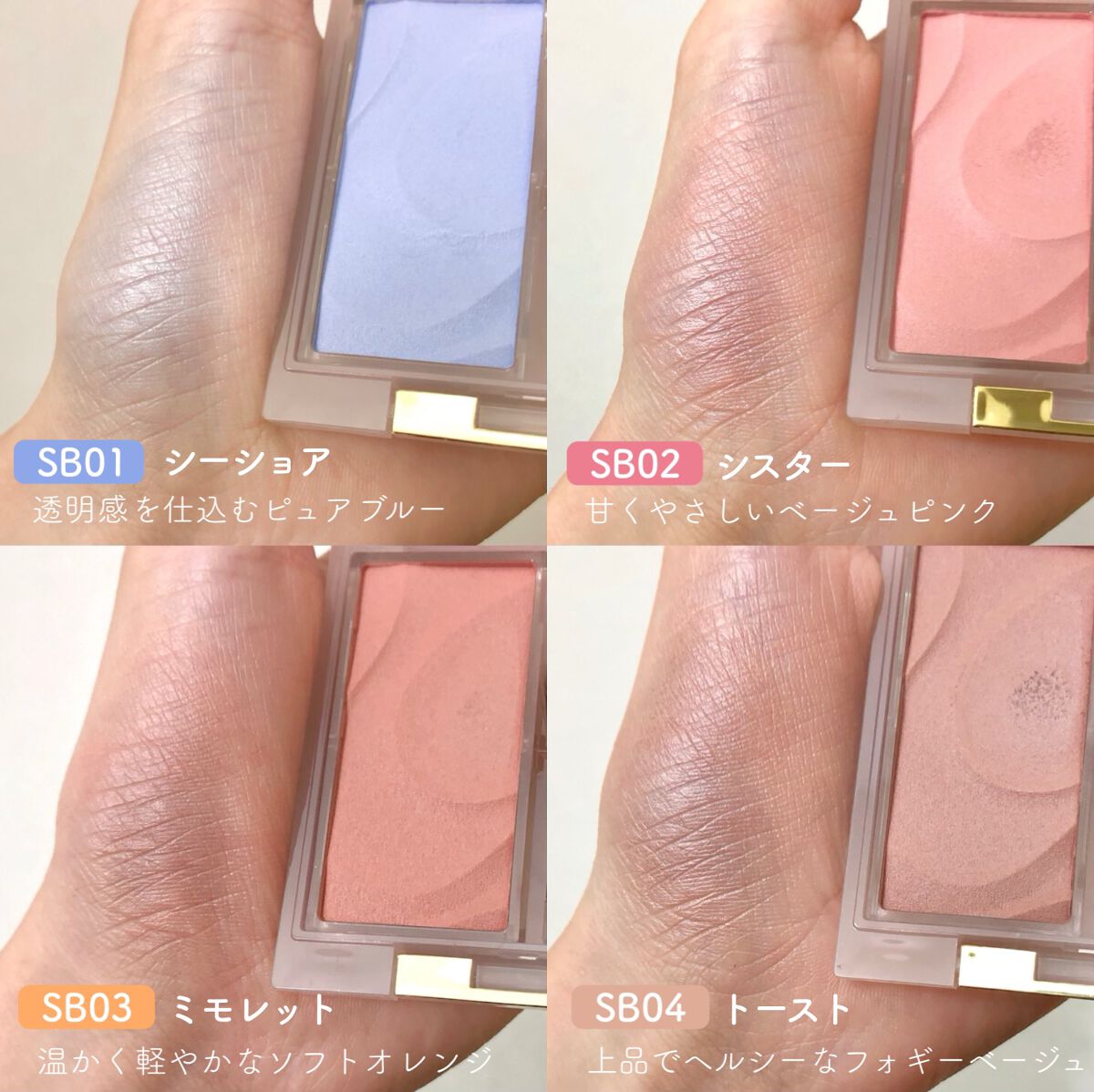 - <SB01 シーショア> タルク、トリエチルヘキサノイン、窒化ホウ素、ポリグリセリル-3ポリジメチルシロキシエチルジメチコン、ラウリン酸亜鉛、トリメチルシロキシケイ酸、メチルトリメチコン、ステアリン酸ソルビタン、セラミドNP、スクワラン、ホホバ種子油、オリーブ果実油、トコフェロール、メチルパラベン、(+/-)グンジョウ、マイカ、酸化チタン、酸化鉄、水酸化Al、赤202、赤226 <SB02 シスター> タルク、トリエチルヘキサノイン、窒化ホウ素、ポリグリセリル-3ポリジメチルシロキシエチルジメチコン、ラウリン酸亜鉛、トリメチルシロキシケイ酸、メチルトリメチコン、ステアリン酸ソルビタン、セラミドNP、スクワラン、ホホバ種子油、オリーブ果実油、トコフェロール、メチルパラベン、(+/-)グンジョウ、マイカ、酸化チタン、酸化鉄、水酸化Al、赤202、赤226 <SB03 ミモレット> タルク、トリエチルヘキサノイン、窒化ホウ素、ポリグリセリル-3ポリジメチルシロキシエチルジメチコン、ラウリン酸亜鉛、トリメチルシロキシケイ酸、メチルトリメチコン、ステアリン酸ソルビタン、セラミドNP、スクワラン、ホホバ種子油、オリーブ果実油、トコフェロール、メチルパラベン、(+/-)グンジョウ、マイカ、酸化チタン、酸化鉄、水酸化Al、赤202、赤226 <SB04 トースト> タルク、トリエチルヘキサノイン、窒化ホウ素、ポリグリセリル-3ポリジメチルシロキシエチルジメチコン、ラウリン酸亜鉛、トリメチルシロキシケイ酸、メチルトリメチコン、ステアリン酸ソルビタン、セラミドNP、スクワラン、ホホバ種子油、オリーブ果実油、トコフェロール、メチルパラベン、(+/-)グンジョウ、マイカ、酸化チタン、酸化鉄、水酸化Al、赤202、赤226 <SB05 ワルツ(限定)> タルク、トリエチルヘキサノイン、ステアリン酸ソルビタン、窒化ホウ素、ポリグリセリル-3ポリジメチルシロキシエチルジメチコン、ラウリン酸亜鉛、トリメチルシロキシケイ酸、メチルトリメチコン、セラミドNP、スクワラン、ホホバ種子油、オリーブ果実油、トコフェロール、メチルパラベン、(+/-)グンジョウ、ホウケイ酸(Ca/Al)、マイカ、金、酸化チタン、酸化鉄、水酸化Al、赤226 <SB06 オーケストラ(限定)> タルク、トリエチルヘキサノイン、ステアリン酸ソルビタン、窒化ホウ素、ポリグリセリル-3ポリジメチルシロキシエチルジメチコン、ラウリン酸亜鉛、トリメチルシロキシケイ酸、メチルトリメチコン、セラミドNP、スクワラン、ホホバ種子油、オリーブ果実油、トコフェロール、メチルパラベン、(+/-)グンジョウ、ホウケイ酸(Ca/Al)、マイカ、金、酸化チタン、酸化鉄、水酸化Al、赤226