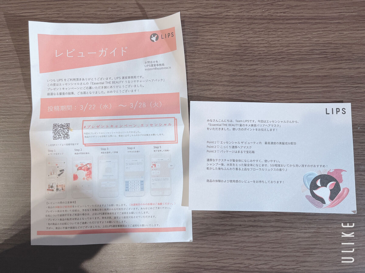 #PR#エッセンシャル#LIPSプレゼントLIPS様のキャンペーンでいただきました。商品特徴はパケ見ていただくとわかりやすいかなと思います。カラー、ブリーチを繰り返したハイダメージ髪にぴったりとのことです。テクスチャーは濃厚です。指でむんずと...