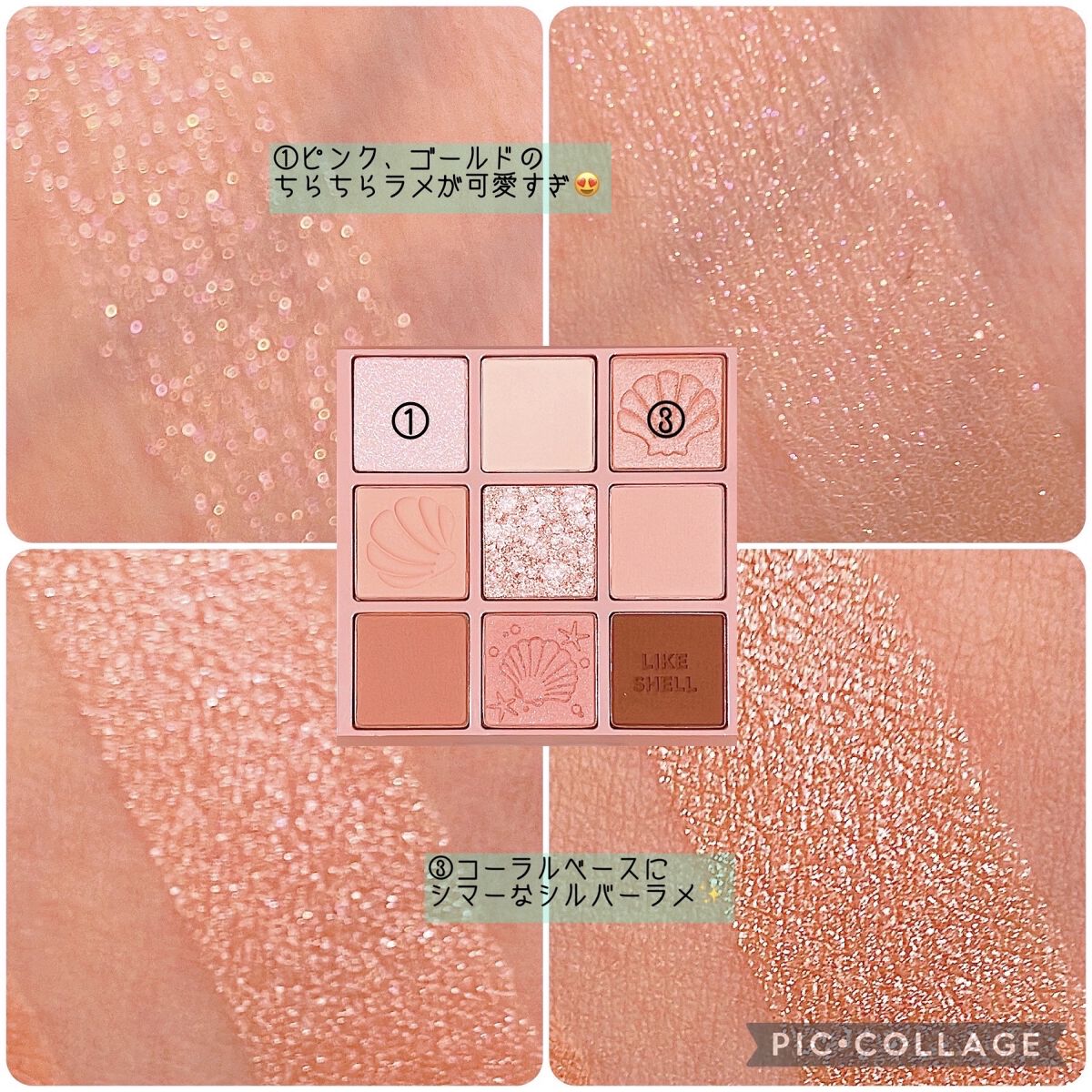 マットはかなりくすんだ色で、暗めのメイクに仕上がりがちに🤎 ツヤ感が大事だと言われるイエベ春でも、スモーキーメイク出来るんだ…!と思わせてくれたパレット。 愛して止まないミルクラテ、絶妙な柔らかベージュに透明感たっぷりのラメ✨️ 全色ラメ入りですが、真ん中2色のくすみと黄みが強く、どんよりした目元に…🥲 コーラルは大好きなんですが、このパレットは3滴白みを足したような色で、発色も弱くまぶたにも乗りづらく、かなり色白さんでないと使えない気がします…🥲 手持ちの中で1番黄み強いですが、1番完成度の高いです💕