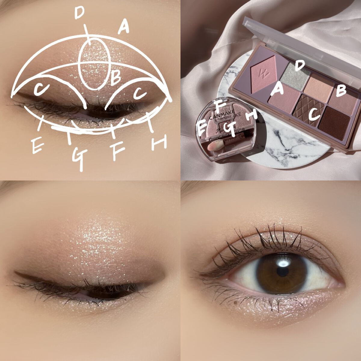 まず色の透明感に驚く! 右上のベージュは、まぶたに馴染むのに綺麗に明るく魅せるカラーでベース仕込みにぴったり✨ 左のラメ2色は言葉はいらないよね。 誰が見ても可愛いと言うだろう、ダイヤモンド並みの輝きを放つラメ✨✨ 右下のブラウンは これもかなり透明感のあるカラー! しっかりめに塗っても濃くなりすぎないカラーで 締め色が苦手な人も塗ってみて🥹 思ってた以上に可愛いアイパレで 大大大満足!!!