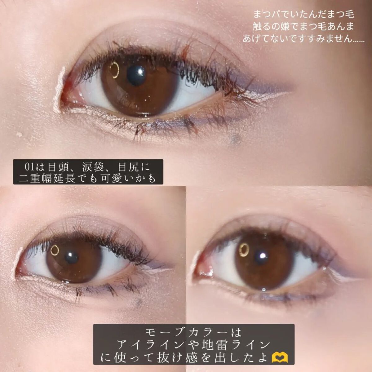特にした三つのカラーはこっくり濃厚ベリーカラーで上品なグラーデーションができます🫶 真ん中の鮮やかプラムピンクは目元や目頭のアクセントに入れると個性的かつかわいいピンクメイクになります✨ 右上のピンク多色ラメはほかの大人っぽい色味に対して逆に美少女感ただよう配色でまたズルいです……キュンとしちゃう…… 特に私はアイホール全体ではなくて目頭にだけ入れることで、少なめのラメでかつ顔全体を鮮やかにすることを意識しました! そして……誰かやってるひといるかな?下粘膜3色グラデ法 目頭赤で潤んだ目、暗めカラーで中顔面短縮、締め色で目幅拡張、全て盛り込んでおります…… 是非皆さんやってみて下さい🫶