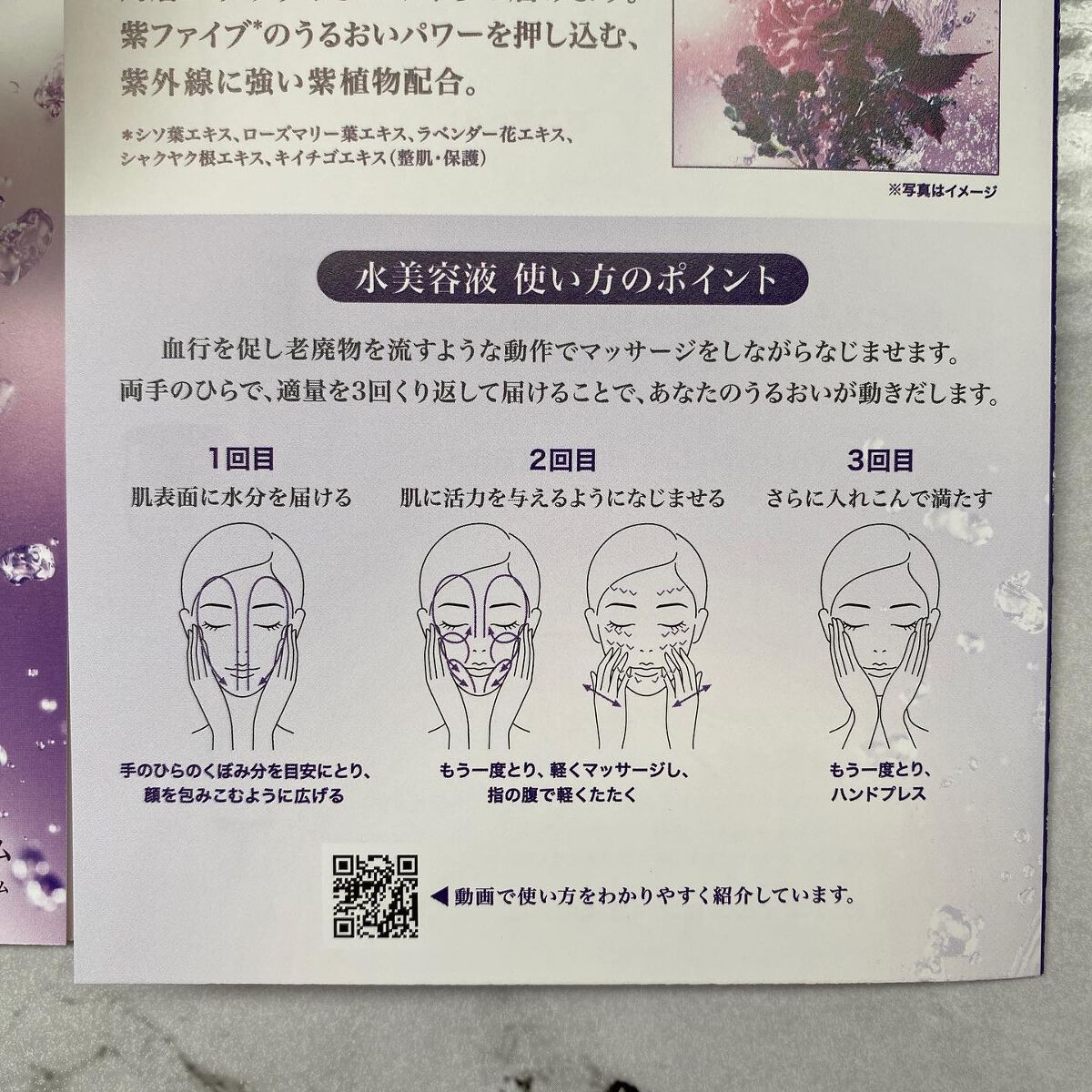 - 紫外線に負けないうるおいパワーを角層深くまで浸透させて、生まれ変わったような肌に導く、“水美容液” ◆「肌にうるおいが入りにくい。」「お手入れをしても、うるおいが続かなくなってきた。」等の肌悩みに、美容成分 を肌のすみずみまでめぐらせて行き届くよう、さらさらのローション状にしました。 美しさが生まれ変わる。最新アプローチ※2、“水美容液”。 ◆洗顔後のファーストステップで、両手使いで押し込むようにマッサージすることで、まるで生まれ変わったよう な、みずみずしいつやのある肌を実現し、うるおいに満ちた肌を長時間守ります。 ◆過酷な紫外線の下でたくましく生きる紫色の植物、紫蘇、ローズマリー、ラベンダー、シャクヤク、木苺の 5 種 を厳選した成分「紫ファイブ※3 」を配合。「光ダメージ」に負けない紫植物のうるおいパワーを、角層深くまで届 けます。 ※2 リバイタル内 ※3 シソ葉エキス、ローズマリー葉エキス、ラベンダー花エキス、シャクヤク根エキス、キイチゴエキス(整肌・保護)