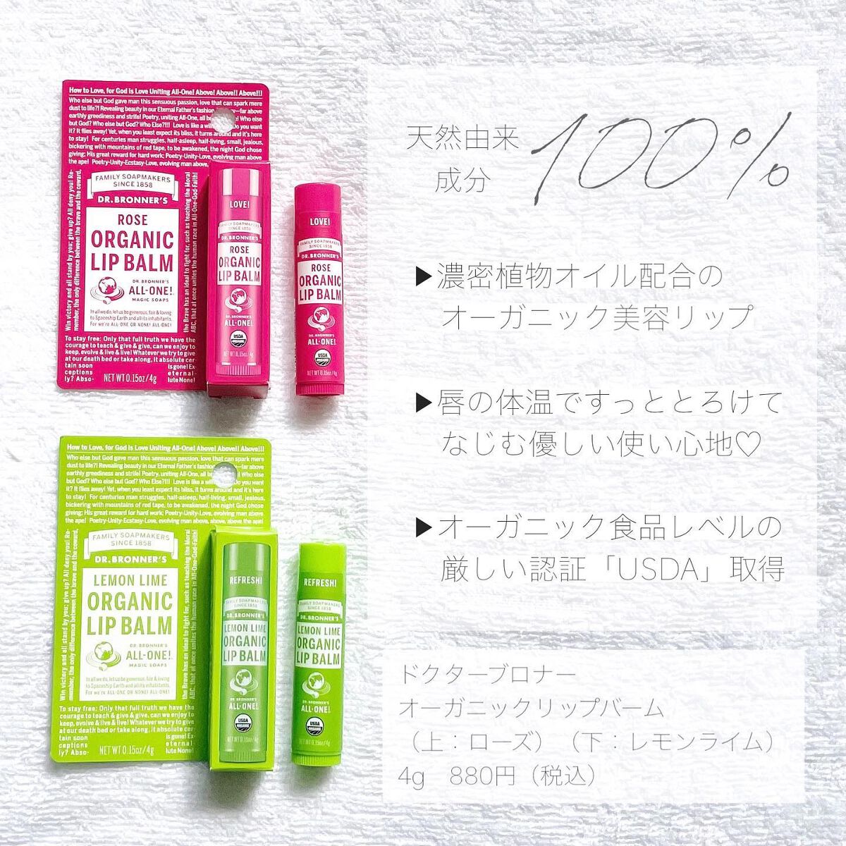 ついに出会えたリピ確定リップバーム❄️ ドクターブロナーのオーガニックリップバームは、唇の上でスッととろけてとってもなめらか。ふわっと唇が柔らかくなるのと、自然なツヤに本当に感動🥺 ドクターブロナーは食品基準の厳しいオーガニック認証を取得し、フェアトレードで調達されたオーガニック原材料で作られているのでとにかく安心感がすごい😢✨ どのリップバームを使っても皮向けしちゃう…という方にもぜひ一度使ってみてほしいです!!心からおすすめします☺️✨