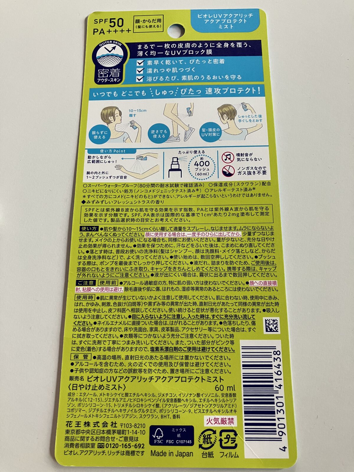 - 「しゅっ」→「ぴたっ」浴びる霧!?からのムラなく密着!いつでもどこでも速攻プロテクトで濡れつや肌続く!瞬感ミストUV。SPF50 PA++++、スーパーウォータープルーフ(80分間の耐水試験で確認済み)。顔・からだ用日やけ止め(髪にも使える)。素早くなじんで、白浮きしない。浴びるたび素肌のうるおい守る。スクワラン配合(保湿成分)。せっけんで落とせる。