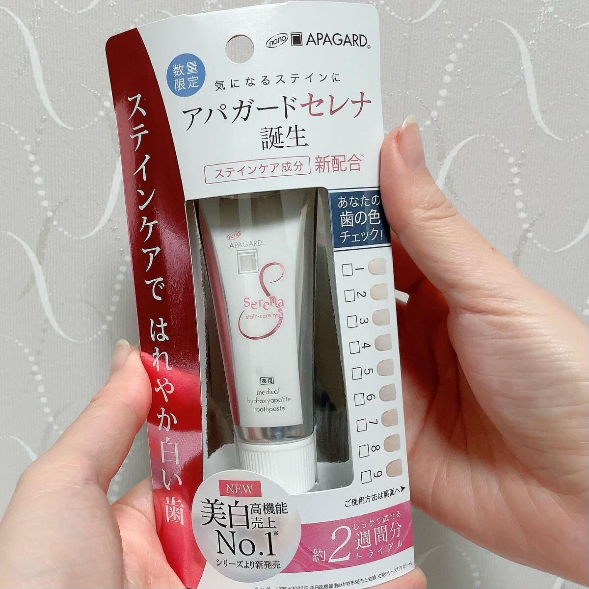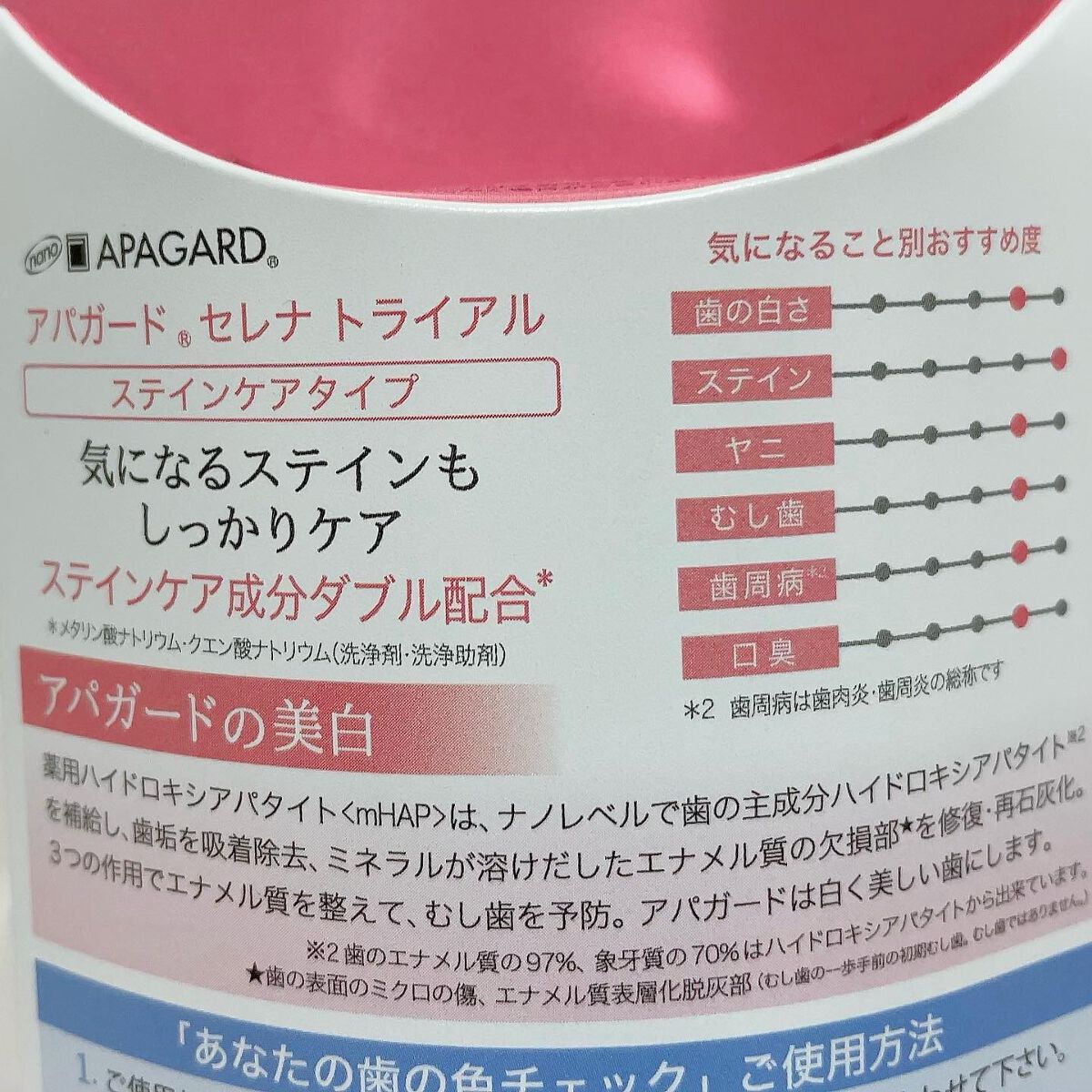 - 【医薬部外品】 美白歯みがき「アパガード」シリーズのステインケアタイプ。サンギ開発のむし歯予防成分「薬用ハイドロキシアパタイト」を配合。歯とほぼ同じ成分(歯のエナメル質の97%はハイドロキシアパタイト)で、エナメル質にアプローチ! さらにステインケア成分をダブル配合*し、コーヒーや紅茶・ワインなどの気になる着色汚れを落とします。 ステインケアではれやか白い歯に。 *メタリン酸ナトリウム(洗浄剤)・クエン酸ナトリウム(洗浄助剤) ●医薬部外品/薬用歯みがき 販売名:サンギMSR