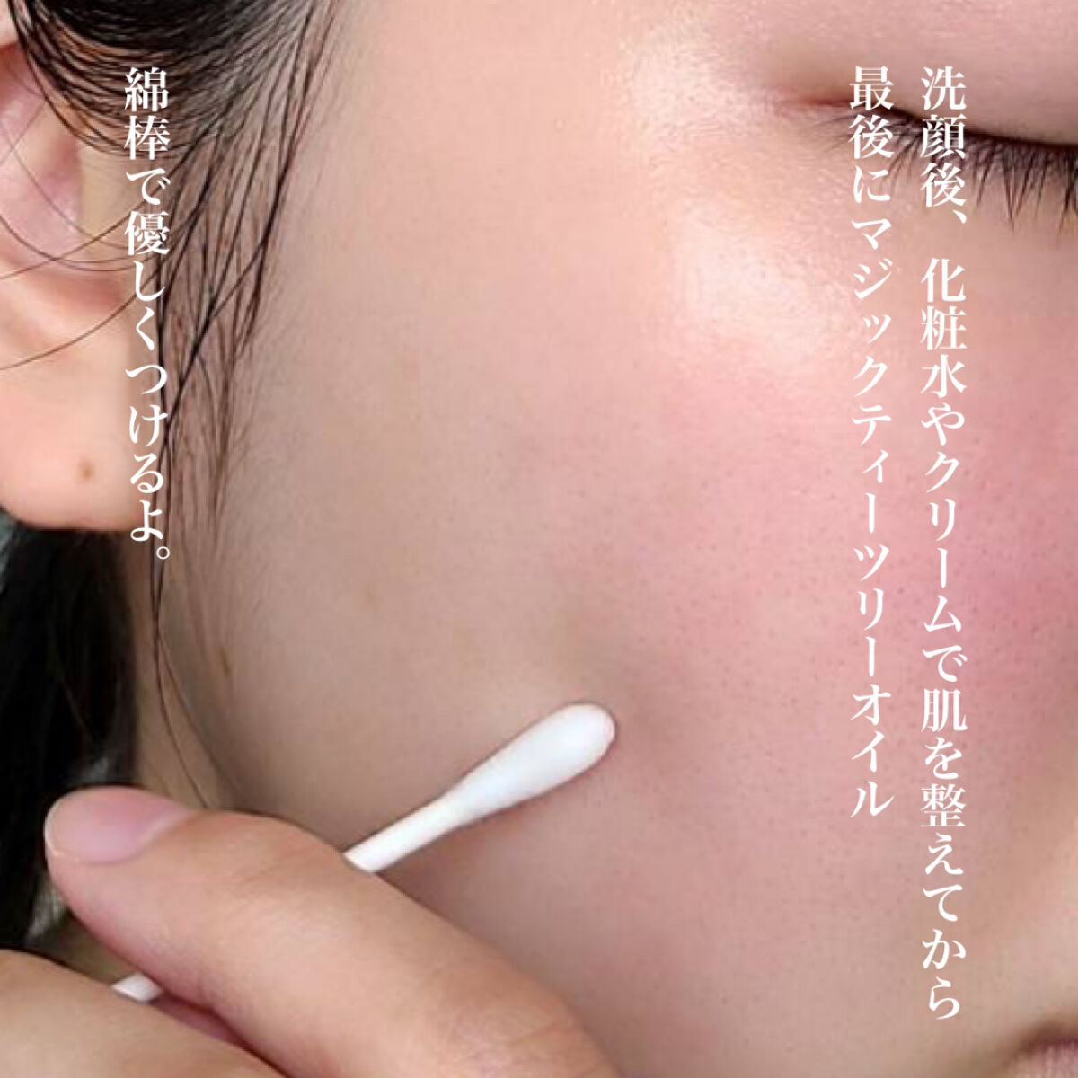 - マジックティーツリーオイルは、乾燥や皮脂による肌悩みをスポットケアし、整える商品です。ブラン代表の整肌成分である4‐テルピネオールで肌トラブルの原因の1つである皮脂を素早くケアします。 【このような方におススメ】 ✔乾燥による肌悩みが気になる方 ✔過度な皮脂と油分が気になる方 ✔べたつきのないスキンケアを探されている方 ✔肌荒れを防ぎたい方 ✔年齢性別肌タイプ関係なく使用できる商品を探されている方 【使用方法】 ①洗顔後、コットンに適量を取り、軽くふき取った後馴染ませます。 ②気になる部分の肌をきれいに洗顔後、トナー→クリームの順でお肌を整えます。 ③綿棒に1~2滴落とし、気になる部分に塗ります。 経過を見て朝晩のスキンケアの最後の段階に塗ることを繰り返します。