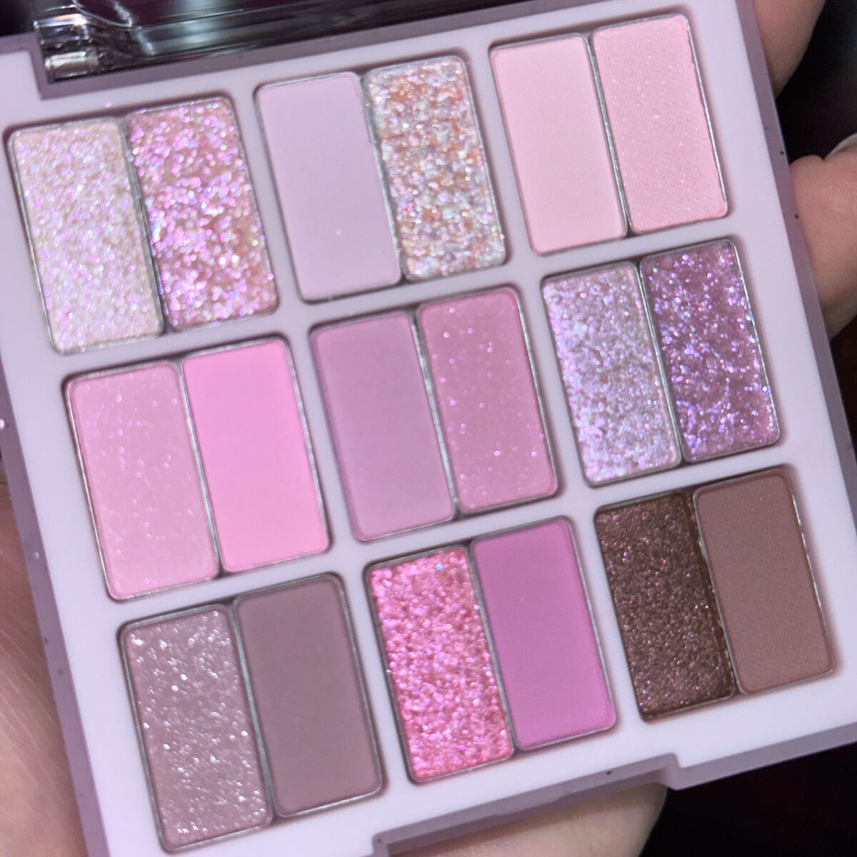 控えめのツヤ感でキメの細かい整いを演出する マットシャドウ!軽やかに光り上品さとわずかなキラメキを演出する シマーシャドウ! 湿式タイプでしっとりした感触で発色が抜群の グリッターシャドウ!いずれも捨て色なく多様なテクスチャーのシャドウ構成で飽きずに使えるパレットです。 めちゃくちゃ可愛いカラバリ♥️ グリッターもピタッと密着していいカラー マットも優しいカラーだから派手にならない!
