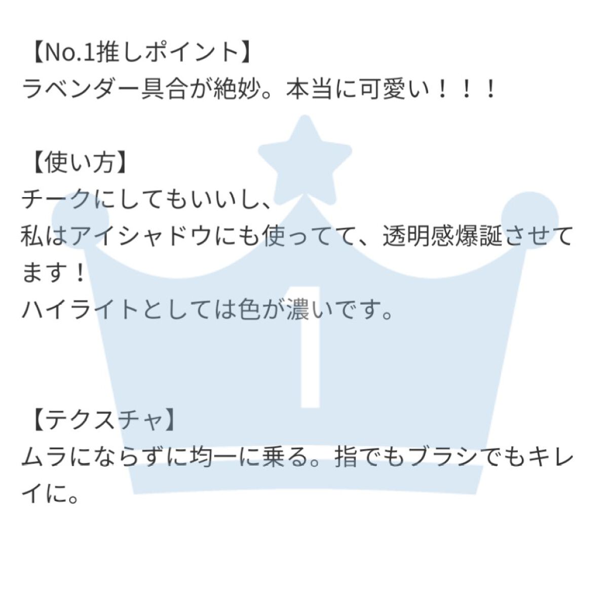 | ハイライト・シェーディングランキング第3位 | 粉質はしっとりしています。 肌馴染みが良くて浮きすぎることなく 使いやすかったです。 | 詳細を見る |