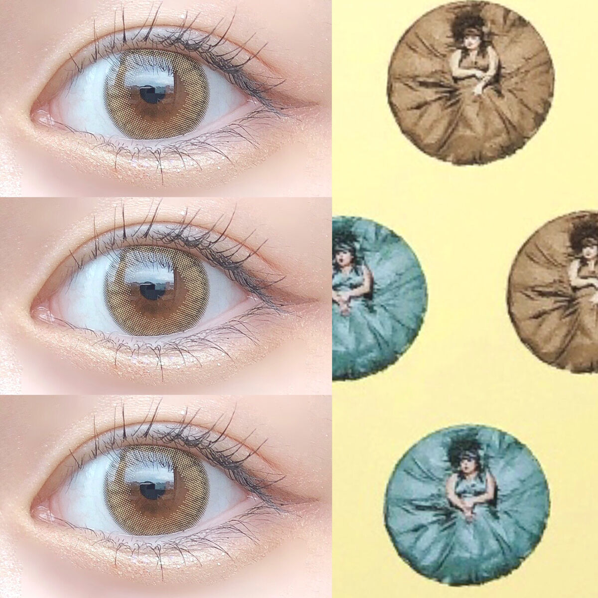 ダークブラウンとイエローのハイライトが綺麗な水光デザインのレンズ✨ ハイライトが瞳に光が差し込んだような輝きを与えてくれるよ☑️ 着色直径も大きすぎないサイズ感だから、ナチュラルに盛りたい日や日常使いにおすすめです! 【どら焼き】というカラー名もかわいい🫶
