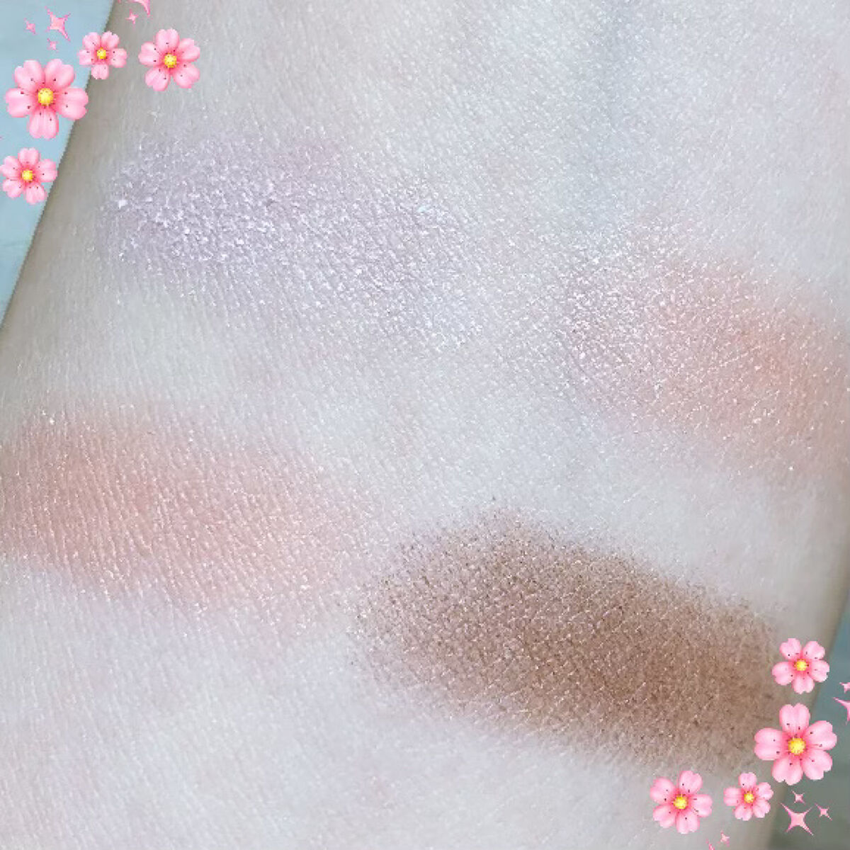 キャンメイクシルキースフレアイズ11ブロッサムシャワー¥825◇質感 4色ともに柔らかくてのびがいいですどのカラーにもたっぷりラメが入っていますが、ラメ飛び、ラメ落ちは気になりませんでした◎ ◇色味 1stブルべ夏/2ndイエベ春 左上→ブル...