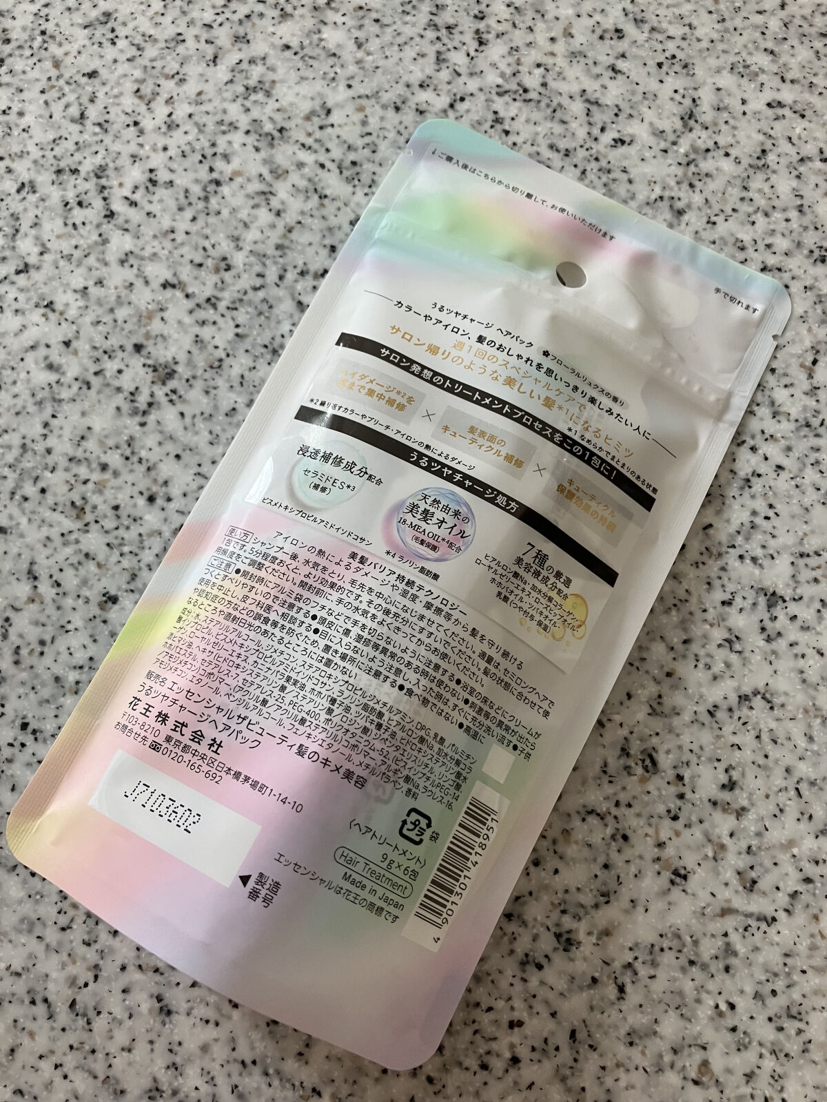 - ○カラーやアイロン、髪のおしゃれを思いっきり楽しみたい人に ○週1回のスペシャルケアで、サロン帰りのような美しい髪*へ(*なめらかでまとまりのある状態) 〇サロン発想のトリートメントプロセスがこの1包に! ○サロンのトリートメントプロセス ・ハイダメージ*を芯まで集中補修。(*繰り返すカラーやブリーチ・アイロンの熱によるダメージ) ・髪表面のキューティクルを補修 ・キューティクルの保護効果の持続 〇うるツヤチャージ処方 ・浸透補修成分配合:セラミドES*(補修)(*ビスメトキシプロピルアミドイソドコサン) ・天然由来の美髪オイル18-MEA OIL*配合(毛髪保護)(*ラノリン脂肪酸) ・7種の厳選美容液成分配合:ヒアルロン酸Na・加水分解コラーゲン・ローヤルゼリーエキス・ローズヒップオイル・ホホバホイル・ツバキオイル・乳酸(つや付与・保湿) 〇アイロン熱による髪ダメージや温度・摩擦等から髪を守り続ける”美髪バリア持続テクノロジー” 〇フローラルリュクスの香り