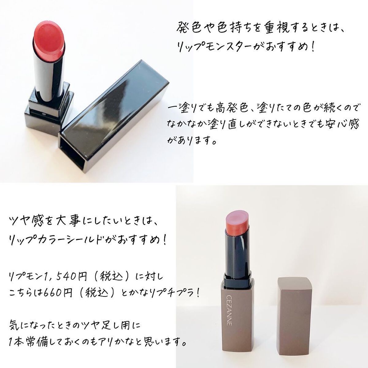 コロナ禍で大バズり不動の怪物 KATE リップモンスター03 (3g) ¥1,540 リプモンを追うように登場 強みは安さ、あとクオリティだけぇ CEZANNEリップカラーシールド01フィグブラウン ¥660 (3.7g) 流石に値段的な意味的にもリプモンの方が持ちがいいのでまぁ、少し下位互換?