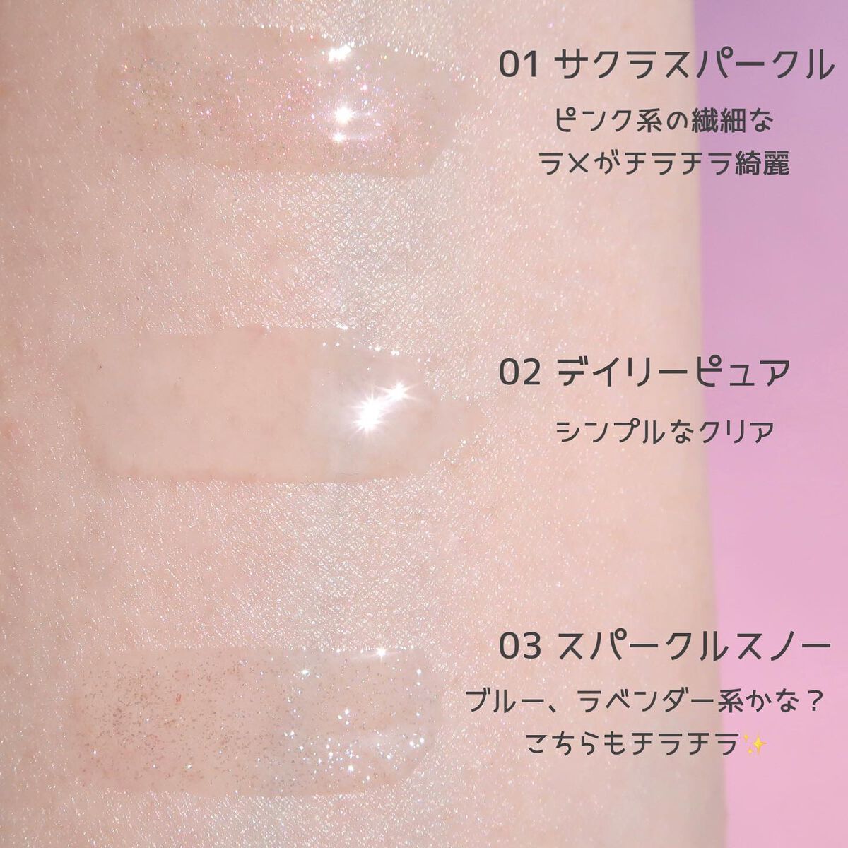 全3色 各¥1,540(税込) ピンクフィーバー 多色ラメがキラッキラ🩵🩷四角いホロがたっぷり■ ピンクベースで可愛らしい🧸←1番好き☺ アイスシュガー 大粒ラメが盛りだくさん🦄! ベースがクリアなのでどんなメイクにも合うけど 存在感抜群なので盛り盛りキラキラな時におすすめ✨ メープルティー シャンパンベージュベースに細か〜いラメがザクザク🫶🏻 デイリーに使いやすいグリッターです🍭 まぶたにピタッと密着してくれるので 上まぶたに使っても二重ラインに溜まったりせず 持ちが良かったです♡これは人気出そう😍💓