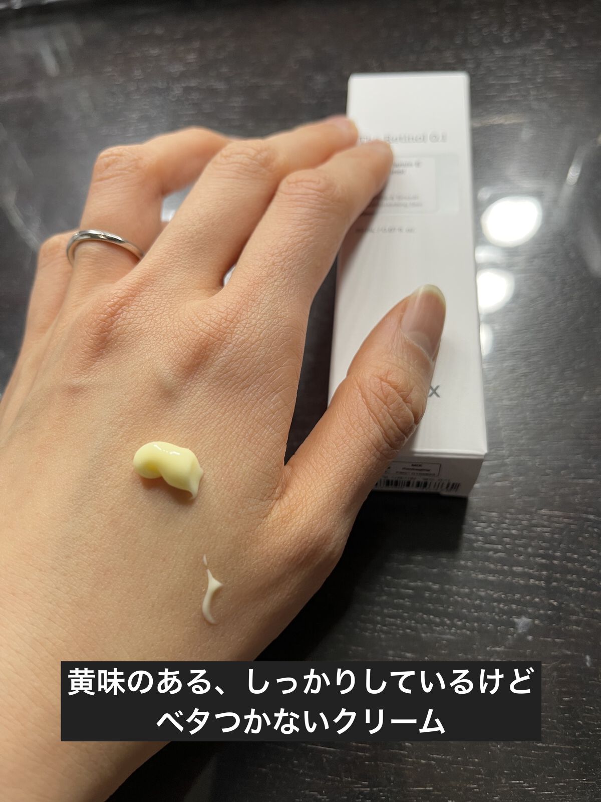 - #初心者向けのレチノール #初めてのレチノール ◎純粋レチノール0.1%安定化処方(保湿成分として) ◎お家で本格的な皮膚科学に基づいた保湿ケアが可能 ◎乾燥による毛穴目立ち/弾力/ハリにこだわりの保湿効果 ・「ノンコメドジェニックテスト(*1)」済み ・「敏感肌対象一次刺激テスト(*1)」済み ・「皮膚一次刺激テスト(*1)」済み 【こんな方におすすめ】 ・乾燥により目立った毛穴がお悩みの方 ・早めにエイジングケア(*2)を始めたい方 ・特に20代におすすめ ・時間が経つとメイクが浮き出る方 【注意事項】 ・アルミチューブの特性上初回オープン時に飛び出す可能性がございますのでご注意ください。 ・品質維持のため冷蔵保存おすすめ *1 )全ての方にコメド(ニキビのもと)や刺激が発生しないということではありません。 *2 )年齢を重ねた肌にうるおいを与えること