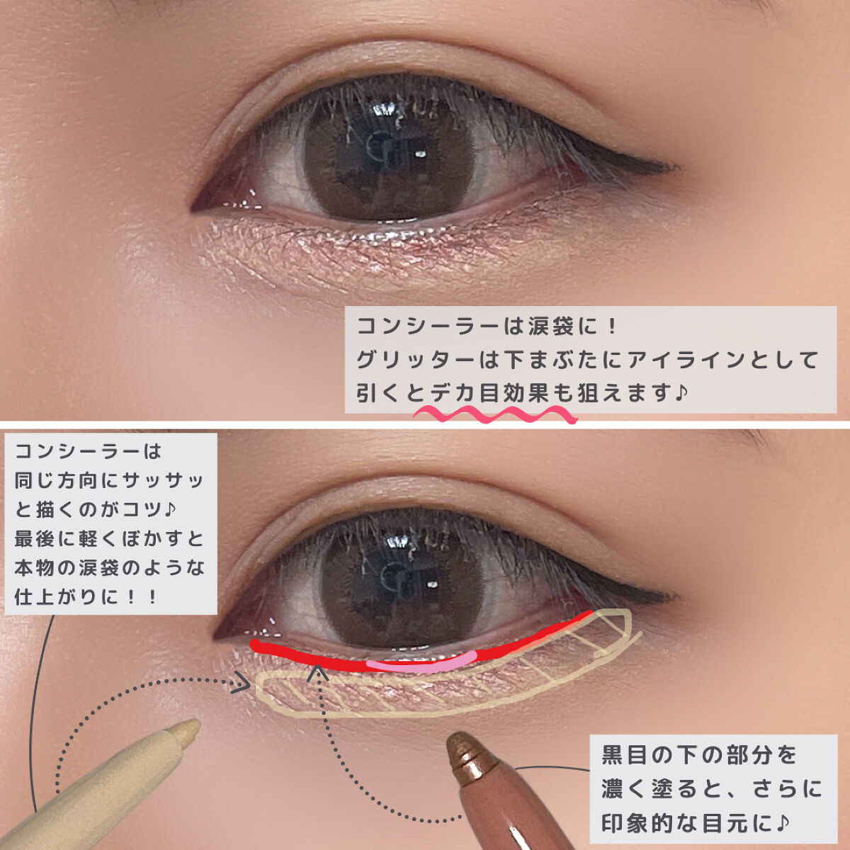 コンシーラーとスティックシャドウが一本になってる涙袋専用コスメ スルスルと力をあんまり入れなくても描けるのが良いところ コンシーラーだけでも涙袋できるけどよりぷっくりさせたい時やラメ感が欲しいときはスティックシャドウを使ってね 01は使いやすいベージュ系 05も使いやすいオレンジ系 07は新色でピンク系 01と05はコンシーラー同じカラーです 誰にでも使いやすいカラーになってます 07はブルベさん向けでコンシーラーも他のより明るめです めちゃめちゃぷっくりしますよ♡