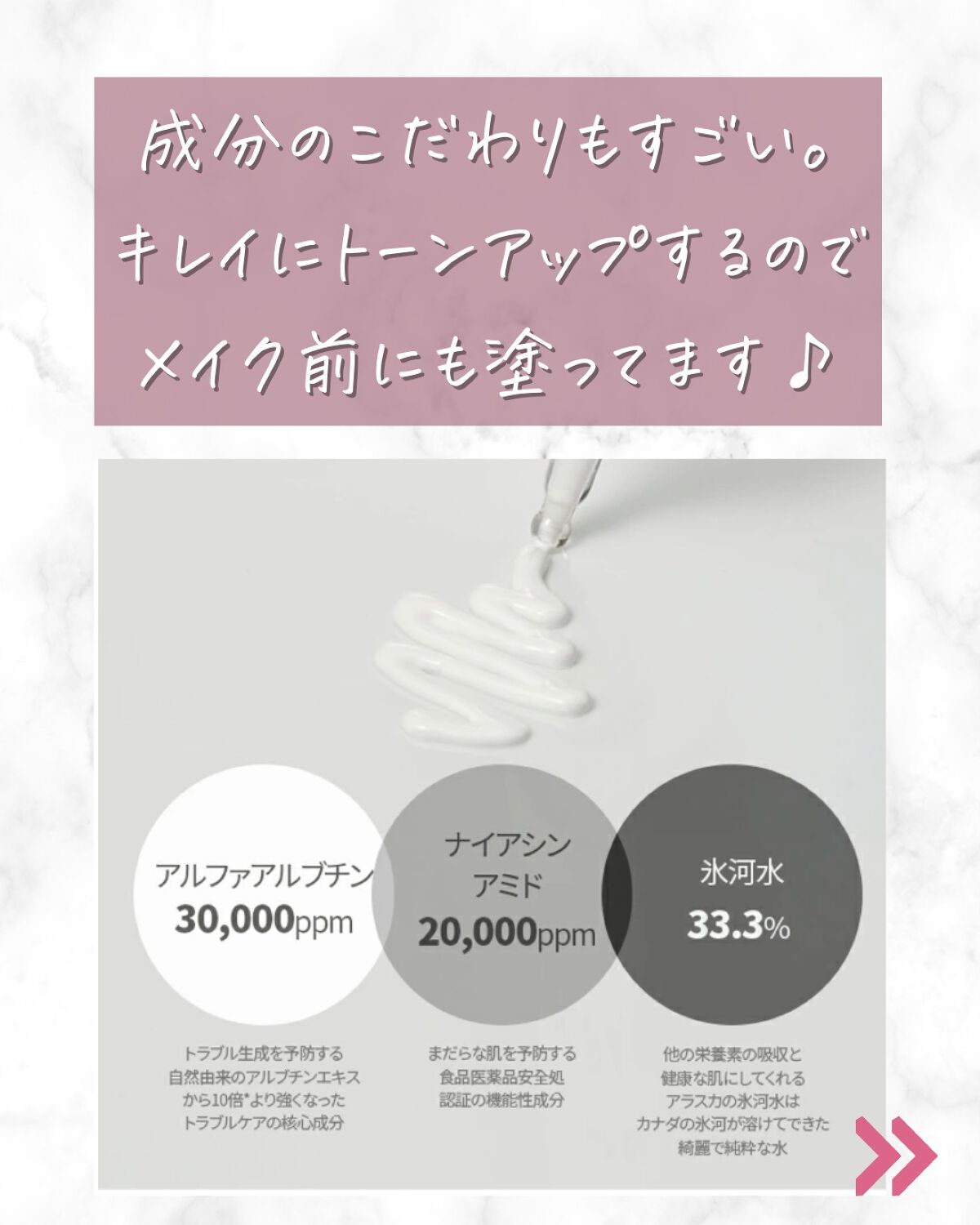 全製品臨床テスト、敏感肌刺激テスト完了済🌿 アルファ アルブチンと保湿に役立つ氷河水配合でしっとりとした明るいお肌に導いてくれる✨ 軽いとろみを感じるウォータリーなテクスチャー💧 ぐいぐいと吸い込まれるようにお肌になじんでいくんだけどやや少なめの量で満足な感じ🥰 仕上がりのお肌はヴェールに包まれているようなシルキーな肌ざわり 顔色が明るくなったように感じます