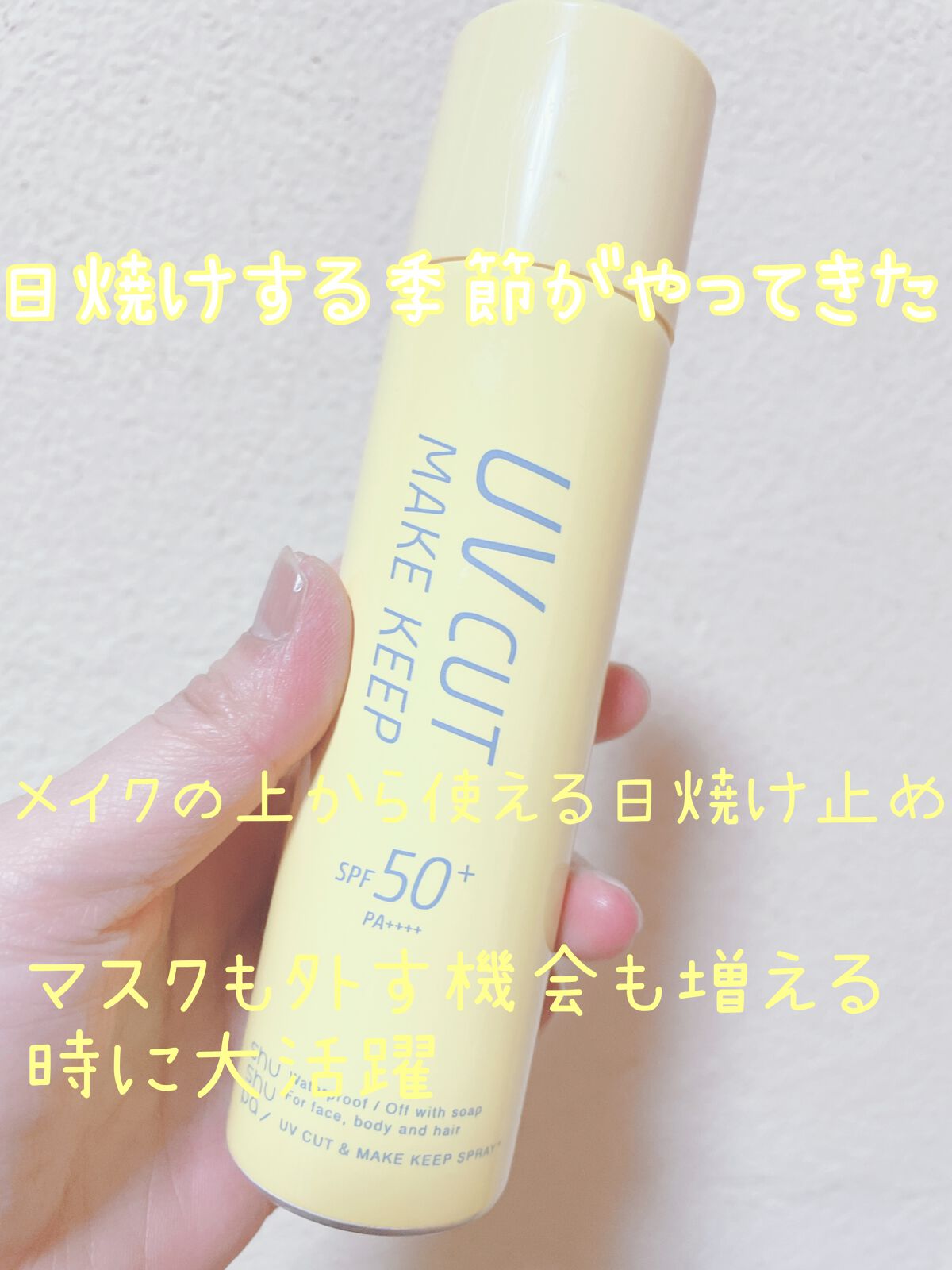 - 【数量限定】 \耐水性★★!国内最高値*1のSPF50+PA++++!/ シュッ!と吹きかけるだけで 「日焼け」「メイク崩れ」を同時にケア #UVカットメイクキープスプレー ≪商品POINT≫ ①1本で顔・体・髪もUVカット 白くならない透明さらさら仕上がりで、全身・髪のUVケアにも! 外出先で日焼けが気になる時に、何回でも塗り直しOK。 ②長時間メイクしたてをキープ*2 皮脂吸着パウダー配合で、夏のドロドロ・ベタベタ崩れと、 テカリを防ぎ、さらさら肌を長時間キープ*2。 ウォータープルーフ処方なのに、石鹼でするんとオフできる! ③紫外線やエアコンによる乾燥を防ぐ CICA成分(ツボクサ葉/茎エキス)をはじめとした夏肌ケアする整肌成分配合。 紫外線や冷房による乾燥ダメージを受けやすいお肌を保湿ケア。 ・美容保湿成分 ビタミンC誘導体*3 / フラーレン / ヒアルロン酸*4 / セラミド*5 / 3重らせんコラーゲン / 加水分解コラーゲン / ソメイヨシノ葉エキス / セイヨウサンザシ果実エキス / ツボクサ葉/茎エキス / セイヨウハッカ葉エキス / キュウリ果実エキス / ヘチマ果実/葉/茎エキス ・美容保湿オイル アボカド油 / ホホバ種子油 / マカデミア種子油 微香性 石鹸オフOK 4つのフリー処方(無着色・無鉱物油 ・パラベンフリー・石油系界面活性剤フリー) *1 SPF・PA値において、国内最高レベルのUVカット力 *2 メイクアップ効果による。効果には個人差があります。 *3 リン酸アスコルビルMg(保湿成分) *4 ヒアルロン酸Na *5 グルコシルセラミド(保湿成分)