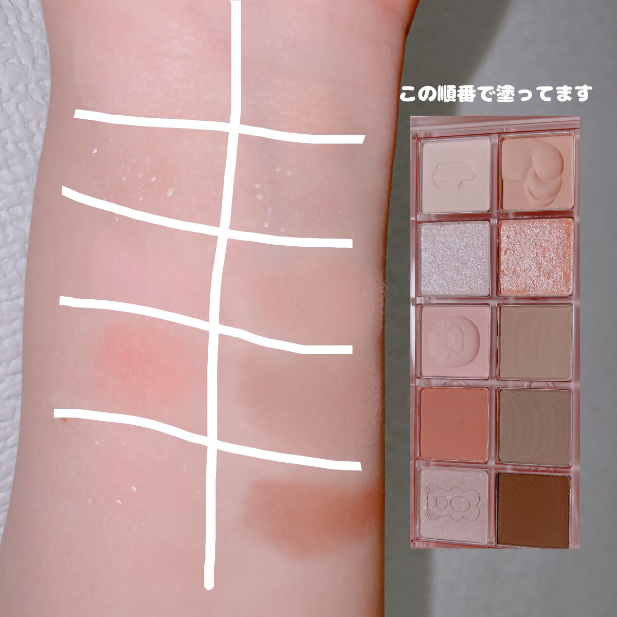 11 ショッピングチーズ イエベ向き?と思いきや、ピンクベージュ寄りだから誰でも使えそうな雰囲気🧡 下段はブラウン系カラーが揃っているのでデイリーとオフ時のメイクにピッタリ 12 クリスタルポー ブルベ大優勝系パレット🏆 青みのあるグリッターやオーロラシマーカラーなど 涼やかなのに可愛さのある色合いでどのシーズンでも使えそう🩷 粉質はしっとり グリッターやシマーカラーもしっとりしてるからラメ飛びが少ないし、濡れツヤ感が出る✨