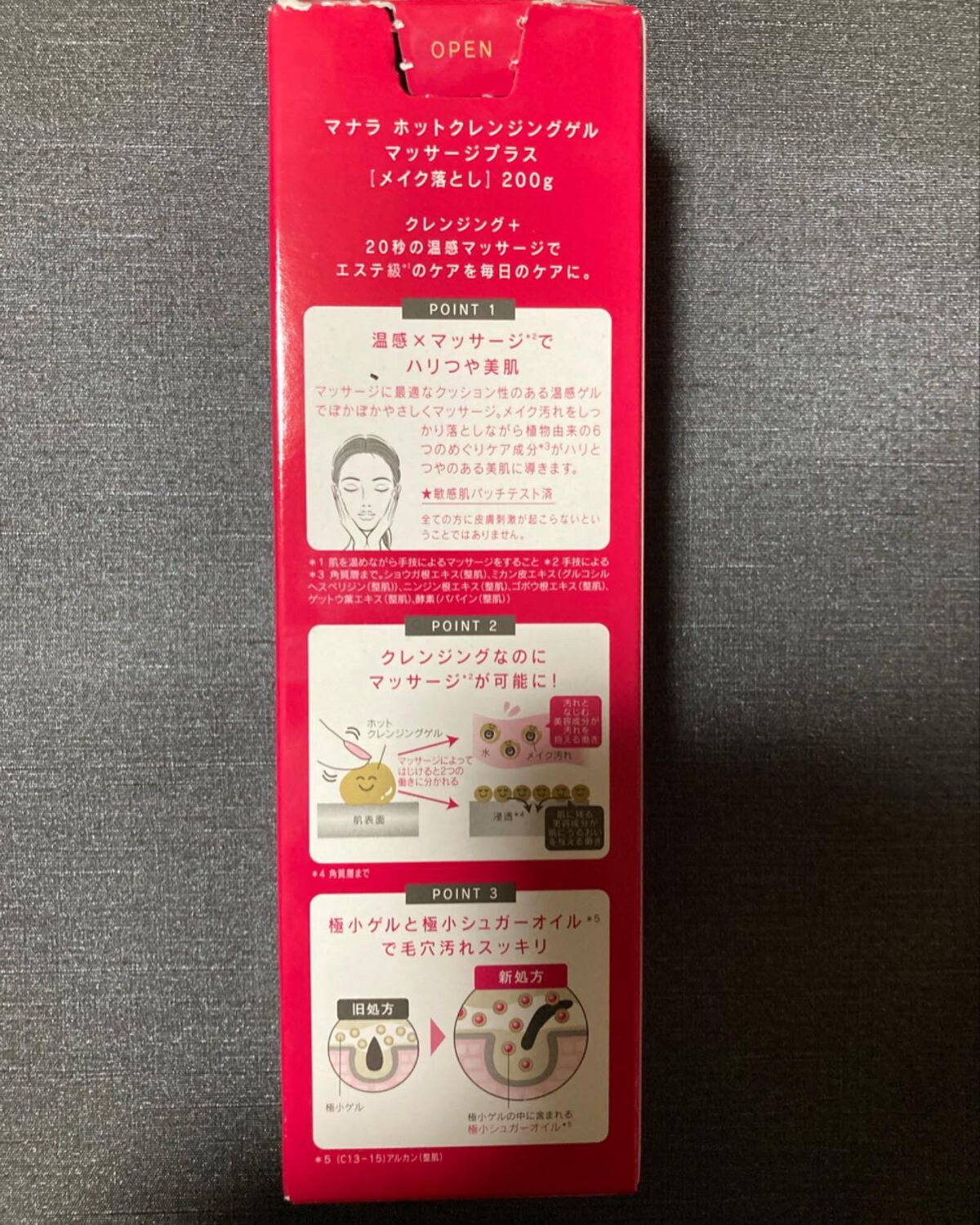 - POINT1 メイクを落としながらマッサージが可能に マッサージをすることで美容成分がはじけ、メイクや黒ずみ汚れを絡め取るものと、肌にうるおいとして残るものとに分かれ、洗い流してもツルツルに! クレンジング後のプラス20秒のマッサージは、毎日でもしていただきたいほどおすすめです。さらに、敏感肌パッチテスト済み*1。 *1 全ての方に刺激がないというわけではございません。 POINT2温感マッサージでハリと透明感アップ! 温感処方によるスチーム効果とマッサージで、硬くなった肌と毛穴を和らげるだけでなく、クレンジングタイムを至福のひと時へと導きます。 6つのめぐりケア成分を追加、さらにハリのある、つややかな肌へと導きます。*1 角質層まで *2・4・5・6 保湿成分 *3 グルコシルヘスペリジン(保湿成分) *7 パパイン、アルギン酸Na(整肌成分) POINT3極小マイクロゲル & 極小シュガーオイル*1で毛穴の奥から汚れを落とす 毛穴よりも小さなマイクロサイズのゲルと極小シュガーオイル*1で、毛穴の奥まで汚れを取り除き、毛穴の目立たない滑らかな仕上がりへ。 *1 (C13-15)アルカン(整肌成分) POINT4 91.3%が美容液 まるで高級な美容液のように、91.3%が美容液成分でできているクレンジング。汚れはしっかり取り除くのに必要なうるおいは肌に残すので、毛穴も目立たなくなり、使う度にうるおいに満ちてハリのあるみずみずしい肌へと導きます。*1 セレブロシド(保湿成分) *2 保湿成分 *3 加水分解コラーゲン、ダイズ種子エキス、セイヨウトチノキ種子エキス、メマツヨイグサ種子エキス、ザクロ果実エキス、プエラリアミリフィカ根エキス(整肌成分) *4 フウチョウソウ葉エキス(整肌成分) *5 パパイン、アルギン酸Na(整肌成分) POINT5マナラこだわりの「7つの無添加」 着色料 合成香料 鉱物油 石油系界面活性剤 エタノール 紫外線吸収剤 パラベン 効果実感はもちろん、肌へのやさしさもとことん追求。デリケートなお肌の方にも喜ばれていいます。 POINT6 1本で8つの機能 〈ホットクレンジングゲル〉は、1本でクレンジング・洗顔の役割を果たすのでダブル洗顔不要。 さらにクレンジング後の肌を和らげ、スキンケアの浸透*2を助けるブースター*2の役割も果たします。*1 毛穴の黒ずみ汚れを洗い流すこと *2 浸透は角質層まで *3 マッサージ行為による