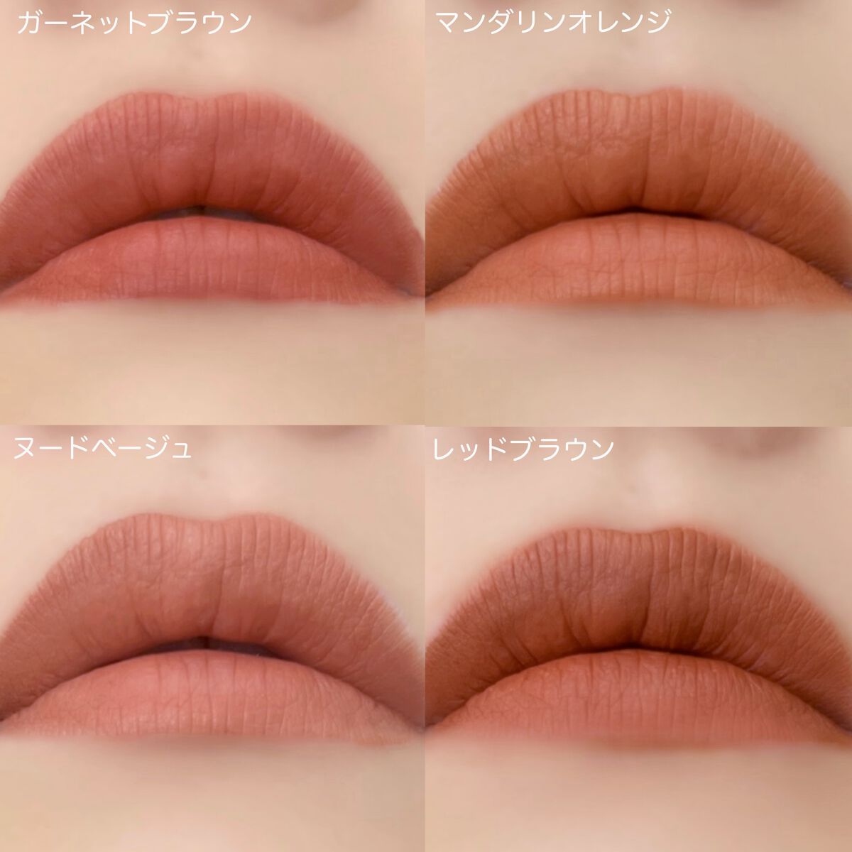 まず私がこのリップを推してる理由は、色が可愛いのと色持ちの良さ。 カラーに関しては、全体的にブラウン味がかっているため、トーンダウンカラーが多く、今っぽい雰囲気になれます✨ マンダリンオレンジは友人から誕生日プレゼントでいただきました🥰 カラーは「リップモンスター マットタイプ 04」に似てると思います🙋♀️ そしてこのリップの良さにハマって、ヌードベージュも購入したら、またカラーがドンピシャでタイプでした(笑) そしてそして、このリップ色持ちも良いところもオススメポイント✨