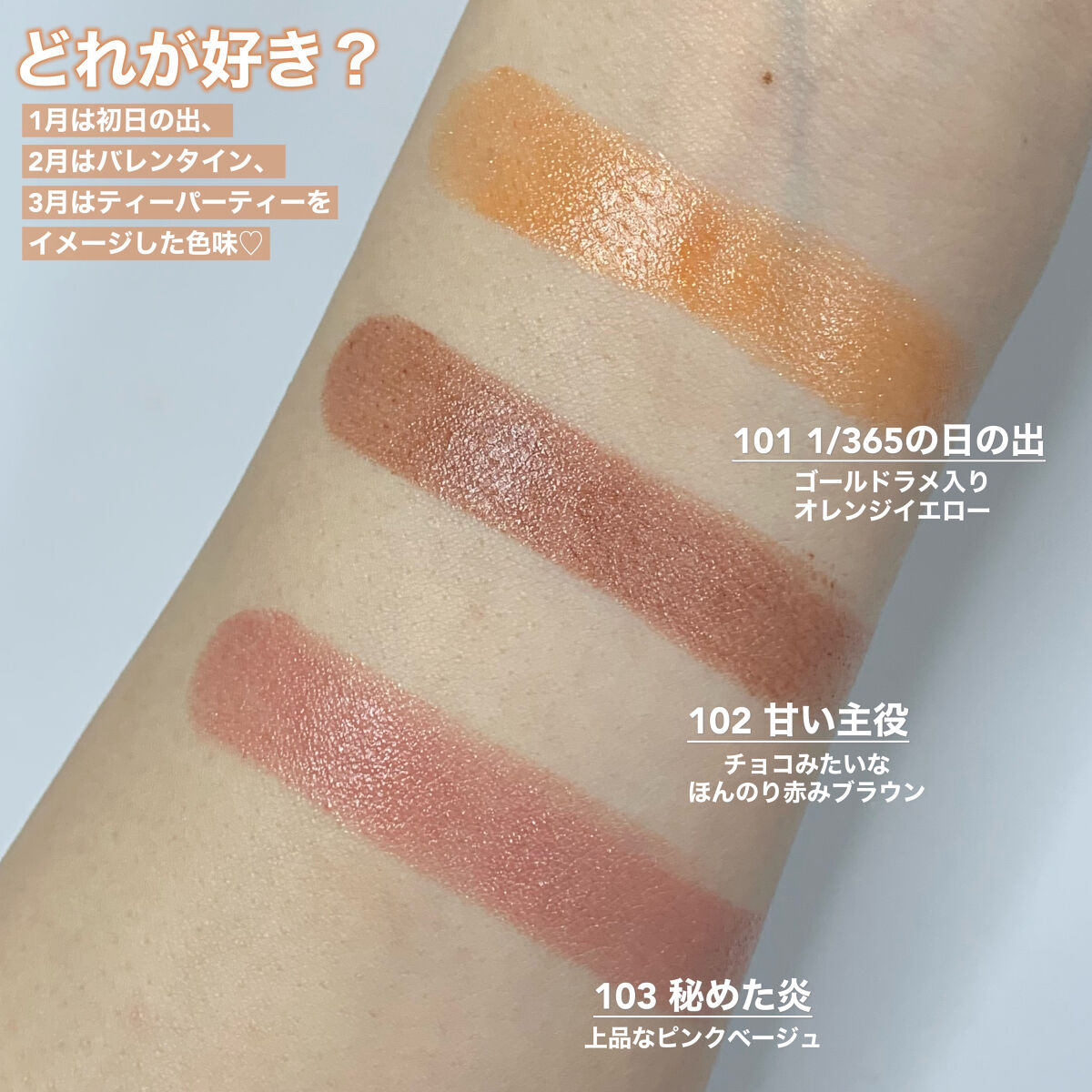 めっちゃくちゃ進化してるーーー😳😳😳 ブラシでも指でも取った瞬間の柔らかさが桁違いに良くなってる!!! ふわっとブレンドしやすくてボカしやすい!!! 05トフィーナッツラテはデイリー使いしやすい ナチュラル発色でかなり自然な仕上がり🥜 今っぽい色味で盛らずに陰影で盛る感じです💗 明度にしっかり差があって陰影をつけやすい◎ 06バニラティーラテはほろ苦ピンクメイクに🎀 05と比較するとかなり強い発色で スモーキーメイクに合いそうなパレット! パレット左から2番目のホワイトラメが ほんとに可愛くて透けるように光る感じ💎
